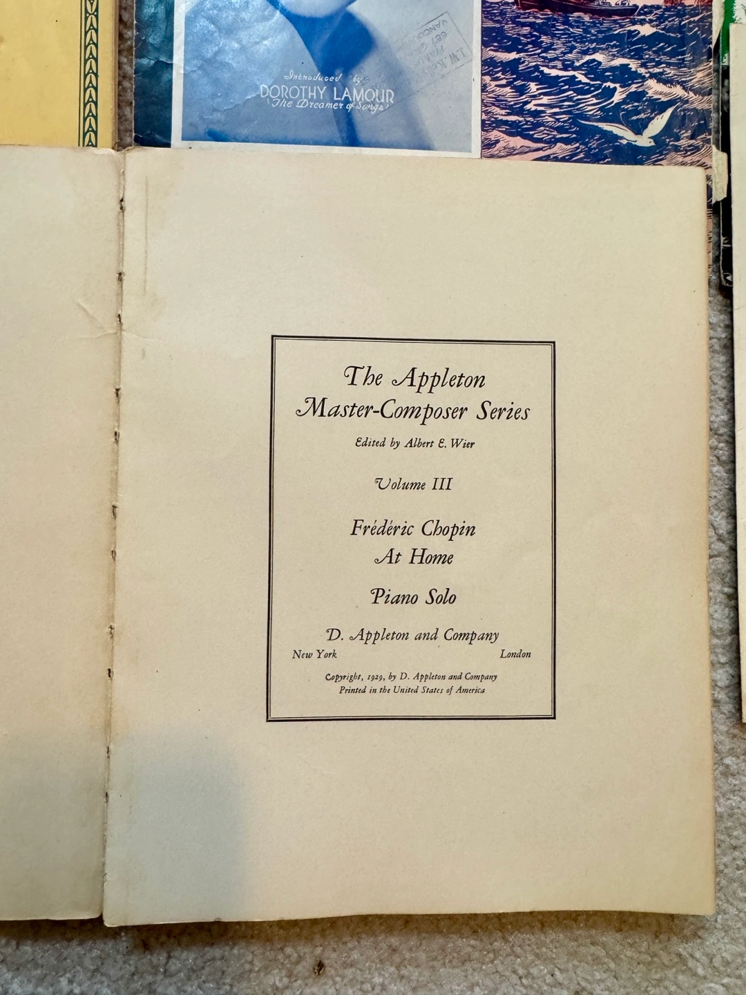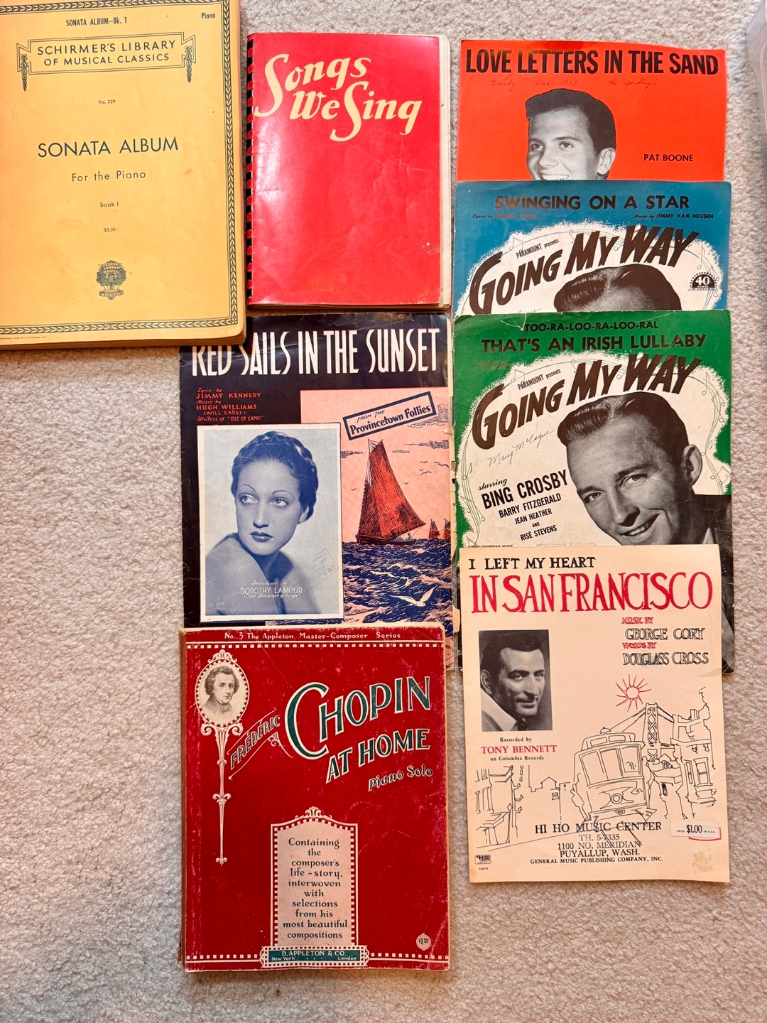 Selling a collection of vintage piano sheet music. Includes Schirmer's Library of Musical Classics Sonata Album, Songs We Sing, Love Letters in the Sand, Swinging on a Star Going My Way, Red Sails in the Sunset, That's an Irish Lullaby Going My Way, I Left My Heart in San Francisco, and Fréderic Chopin At Home Piano Solos.