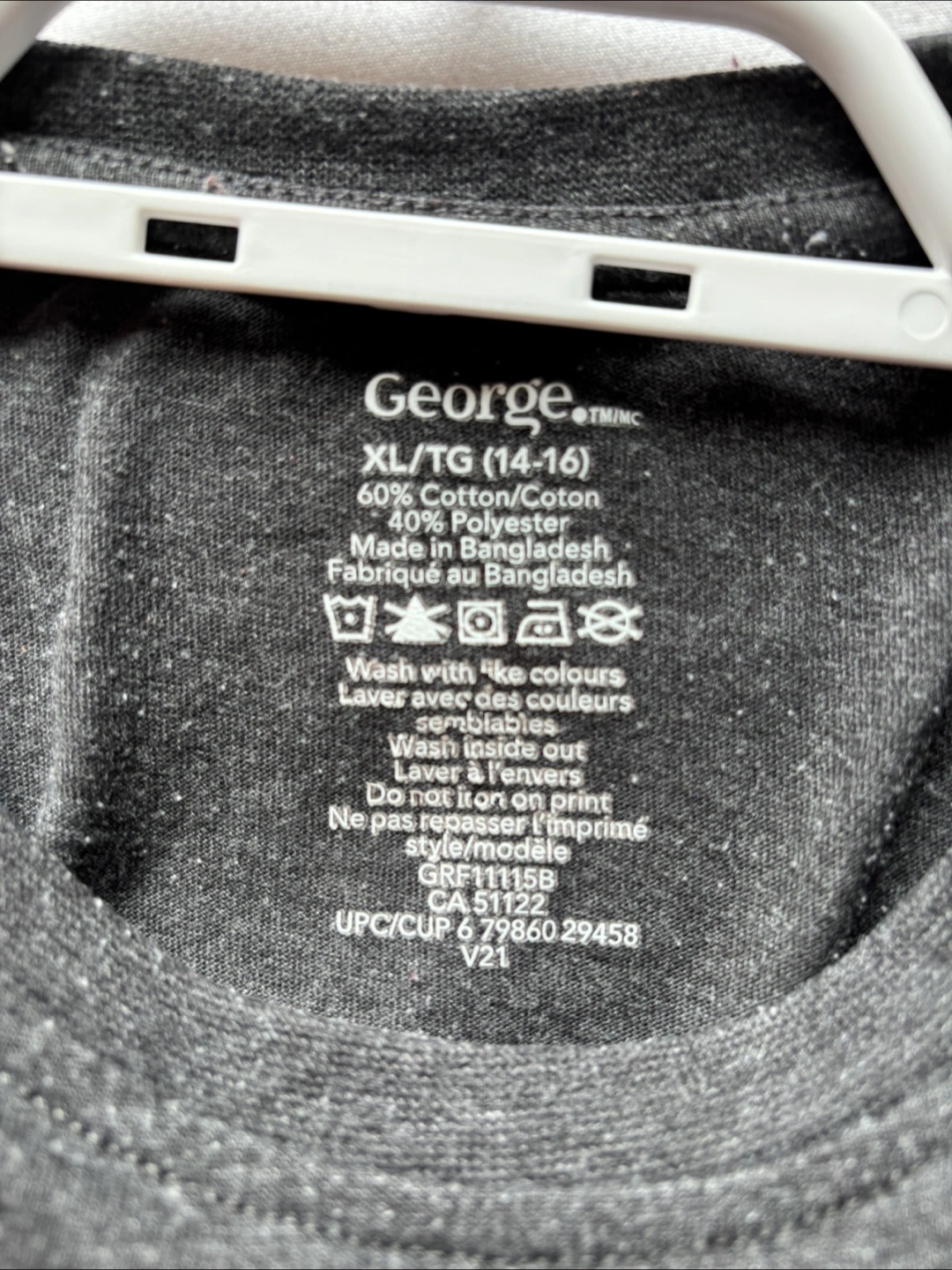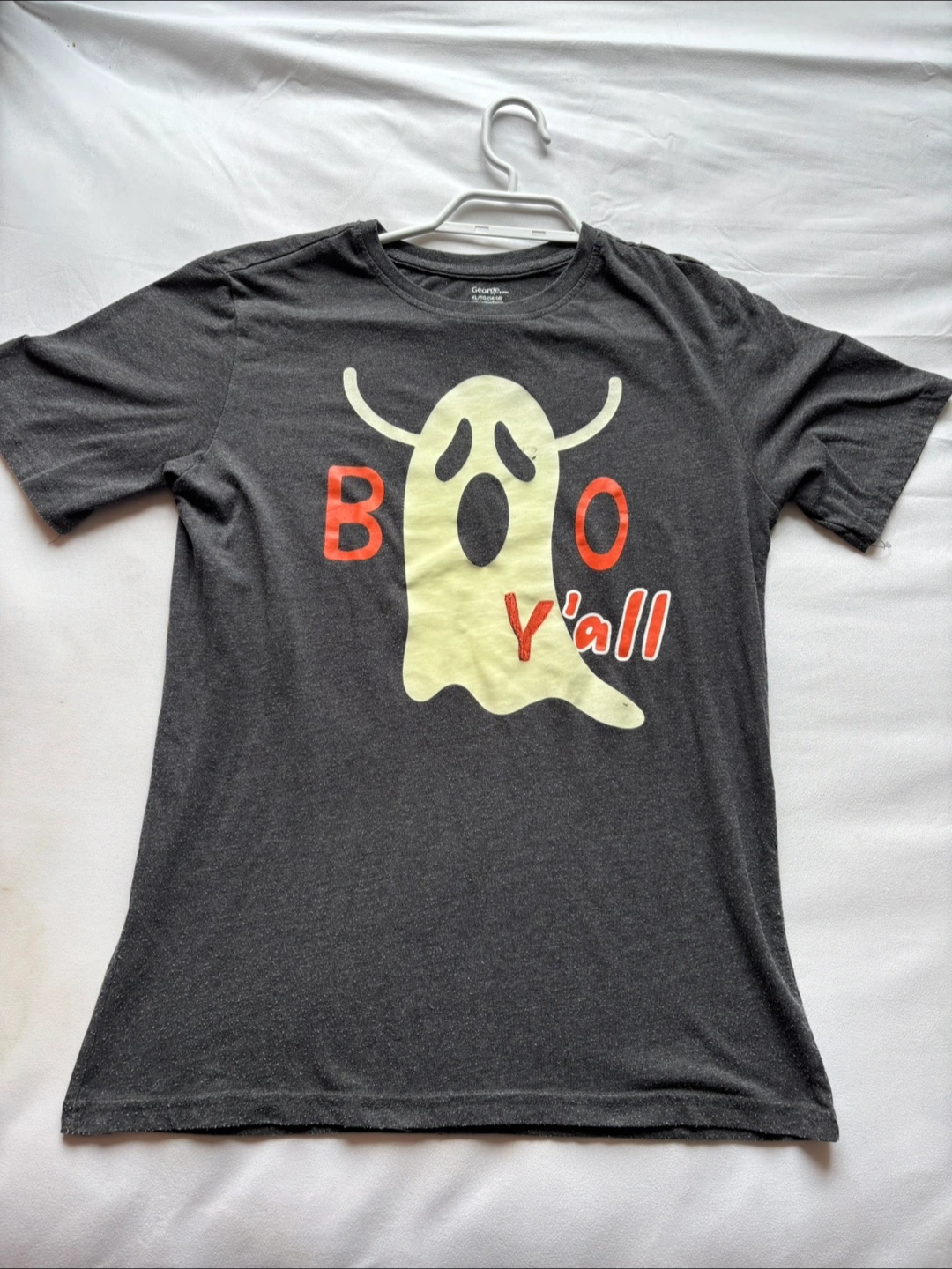 I'm selling a George brand t-shirt in size XL (14-16). It's a dark grey colour and features a 'Boo Y'all' ghost design. The material is 60% cotton and 40% polyester. Perfect for Halloween!