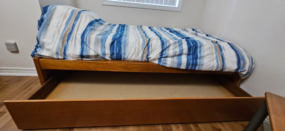 Selling a wooden single bed, perfect for a kid's room or guest room! It comes with a convenient trundle for extra sleeping space or storage. The bed is in good condition and ready for a new home