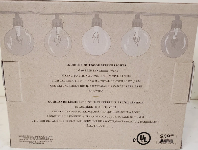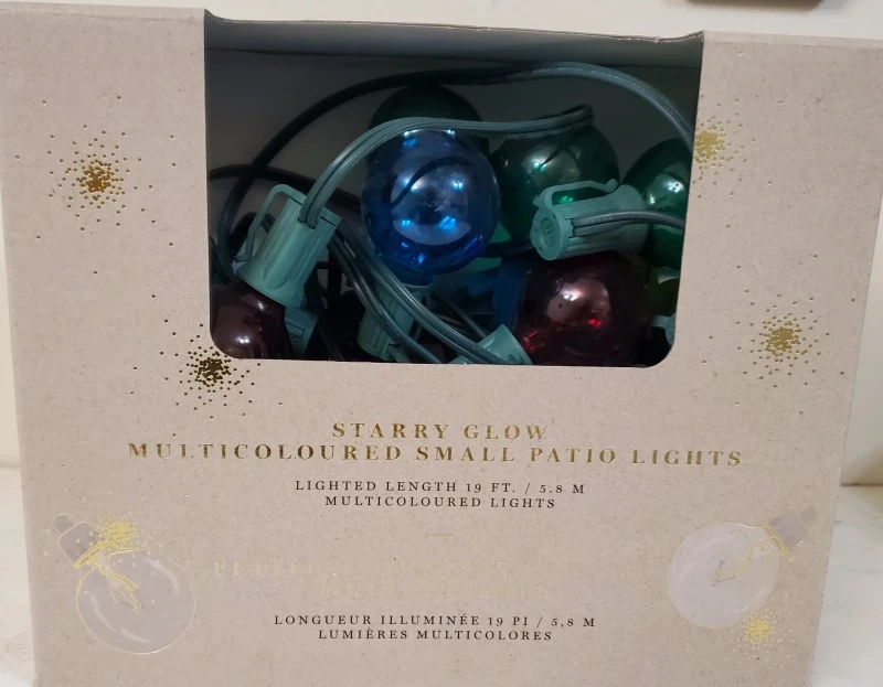 Add some colour to your patio with these Indigo Starry Glow multicoloured small patio lights! They're indoor & outdoor string lights with 20 G40 lights and green wire. The lighted length is 19 ft / 5.8 m and the total length is 20 ft / 6 m. They use a 5 watt/G40 E12 candelabra base replacement bulb. Originally bought for $39.50. The box is included