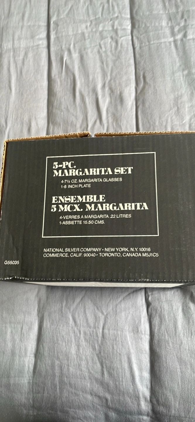 Selling a Royal Leerdam 5-piece margarita set, still in its original box! The set includes four 7.5 oz margarita glasses and a 6-inch plate. It's the Ensemble 5 MCX Margarita set from National Silver Company.