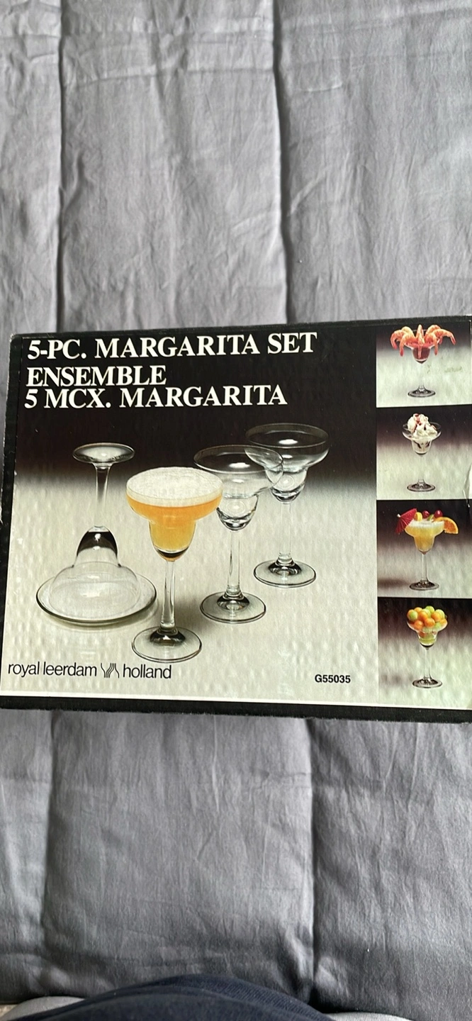 Selling a Royal Leerdam 5-piece margarita set, still in its original box! The set includes four 7.5 oz margarita glasses and a 6-inch plate. It's the Ensemble 5 MCX Margarita set from National Silver Company.