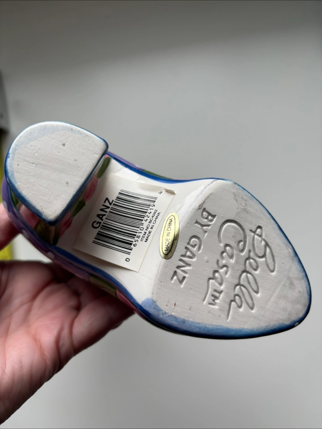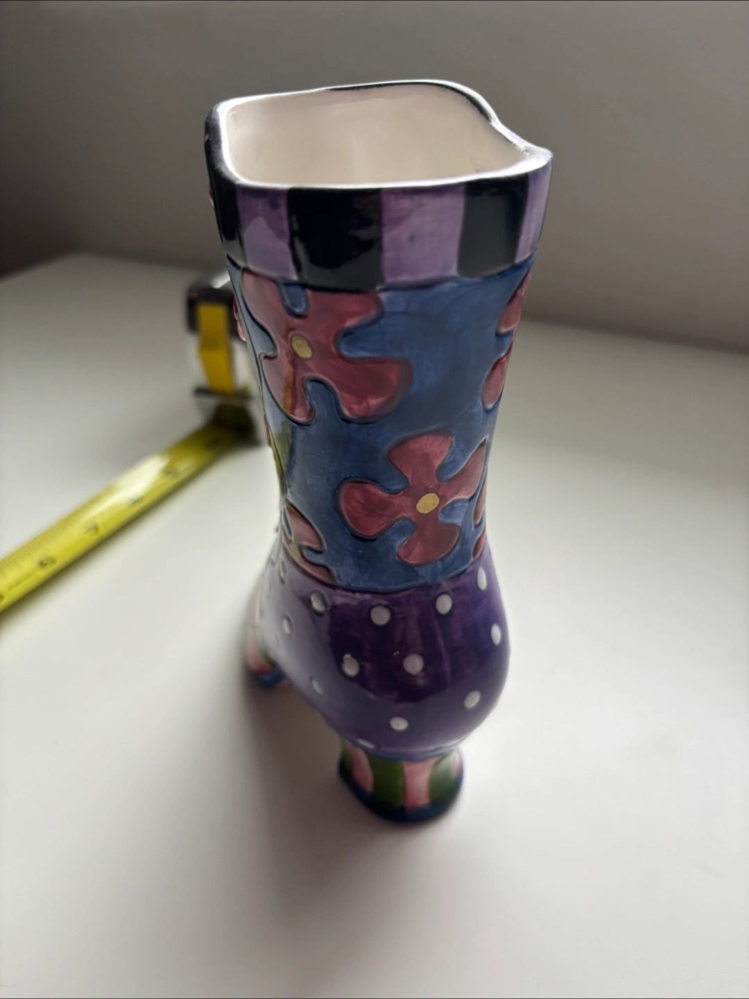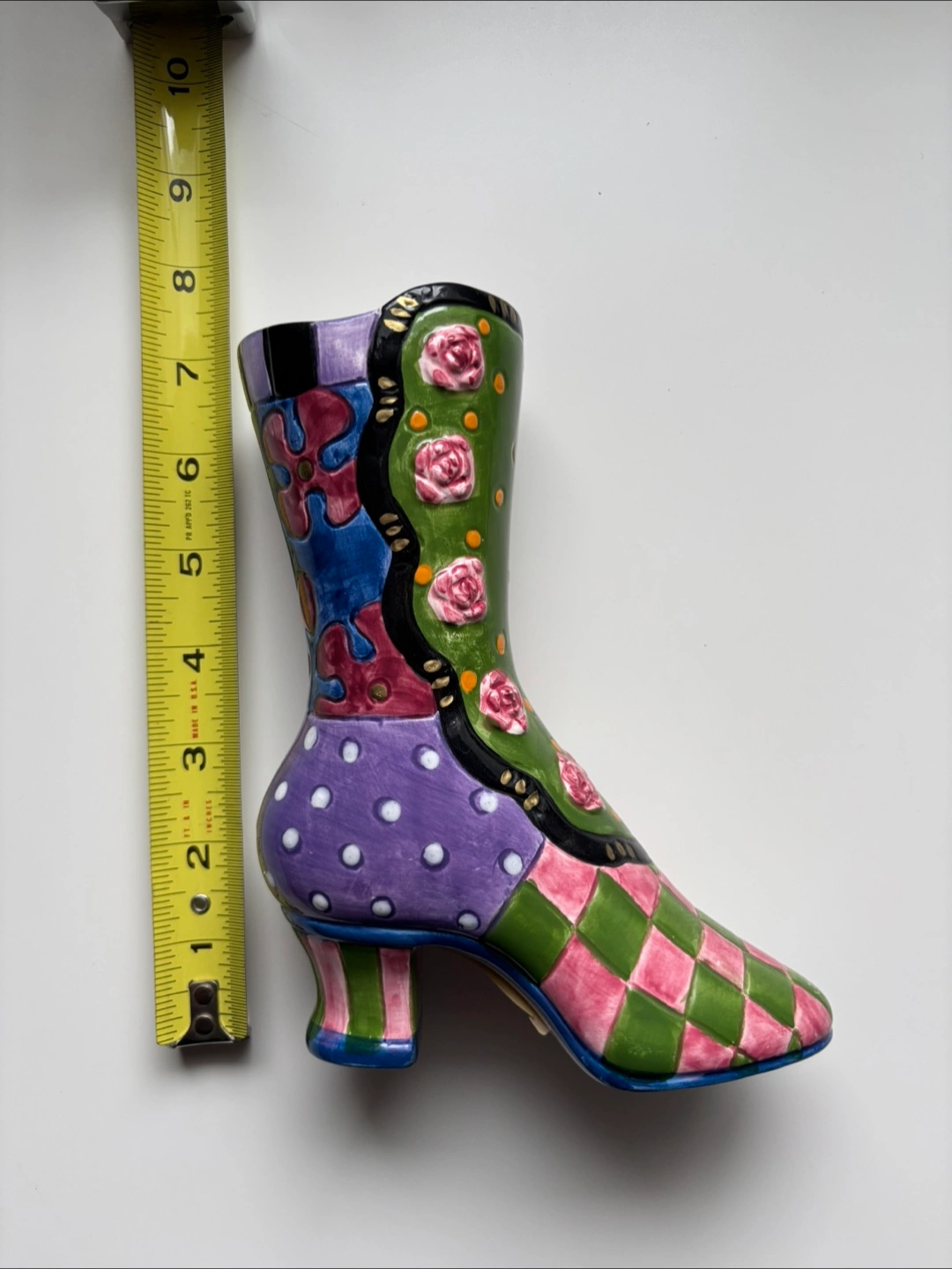 This is a Bella Casa by Ganz boot vase! It is approximately 8 inches tall and features a colourful design with roses, polka dots, and checkered patterns. It would make a lovely addition to any home!