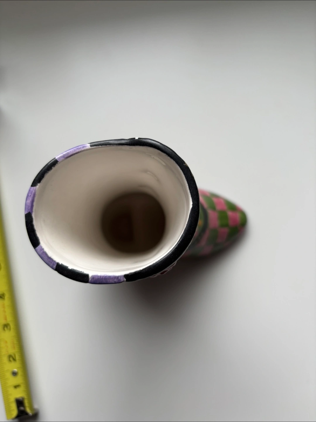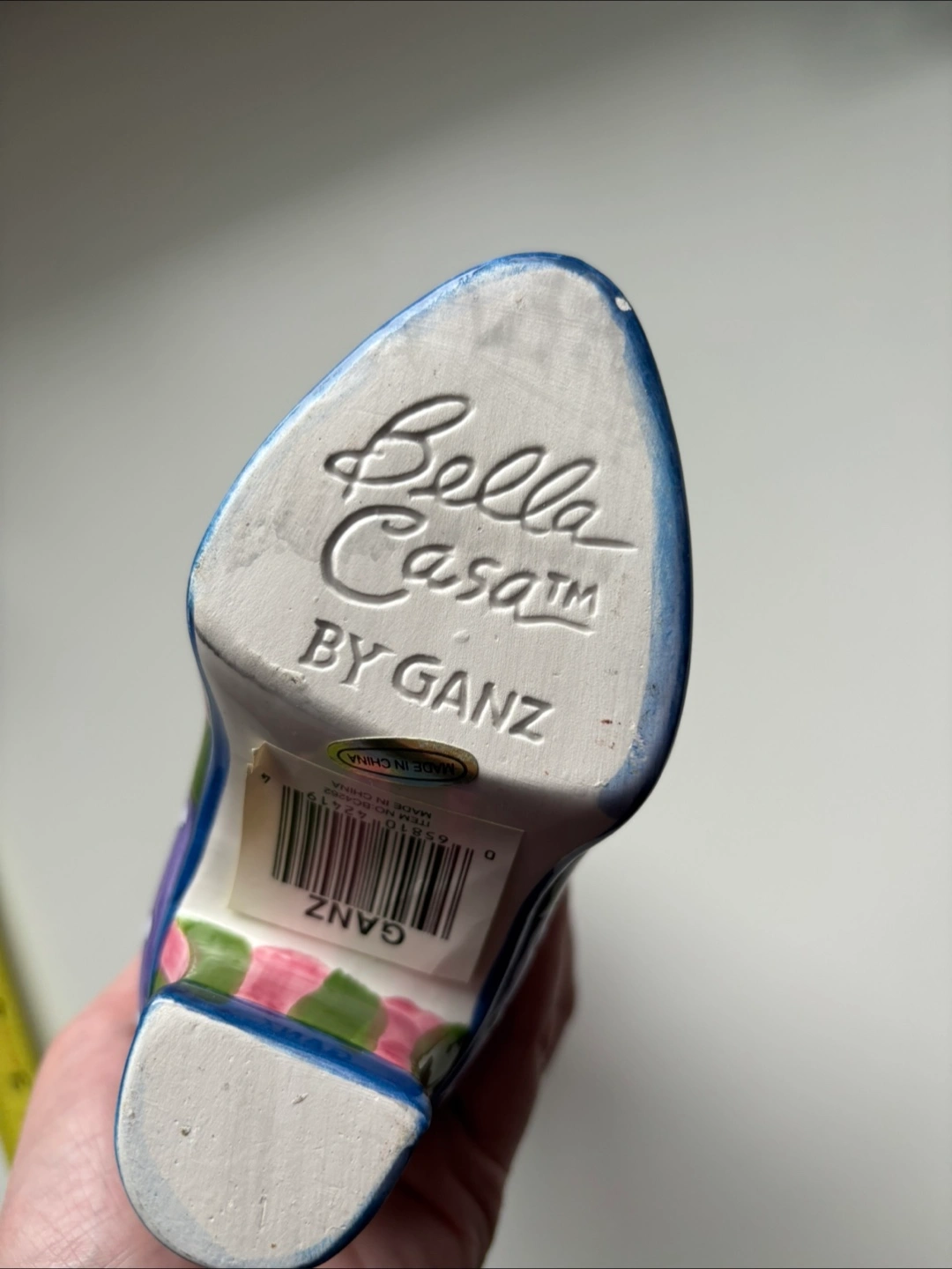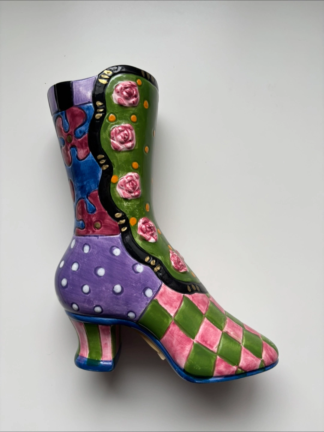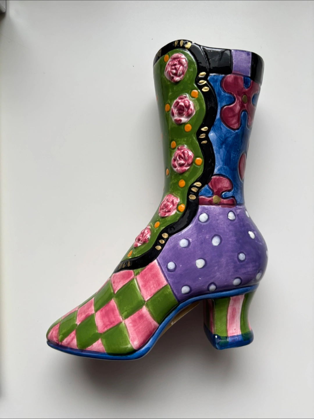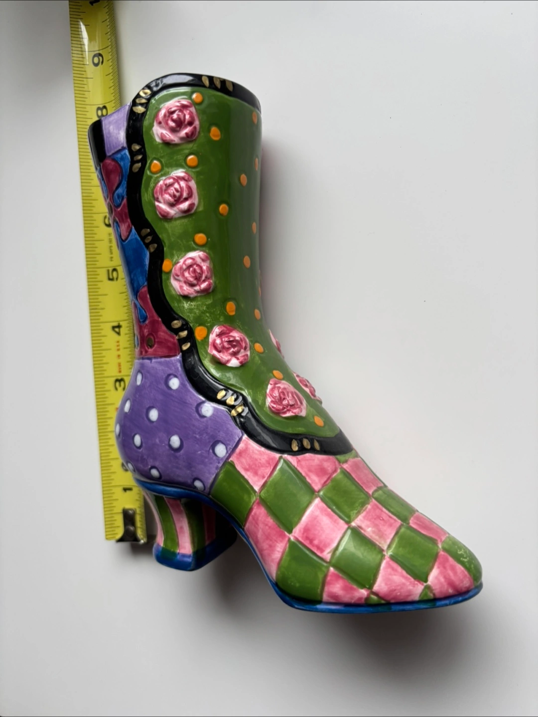 This is a Bella Casa by Ganz boot vase! It is approximately 8 inches tall and features a colourful design with roses, polka dots, and checkered patterns. It would make a lovely addition to any home!