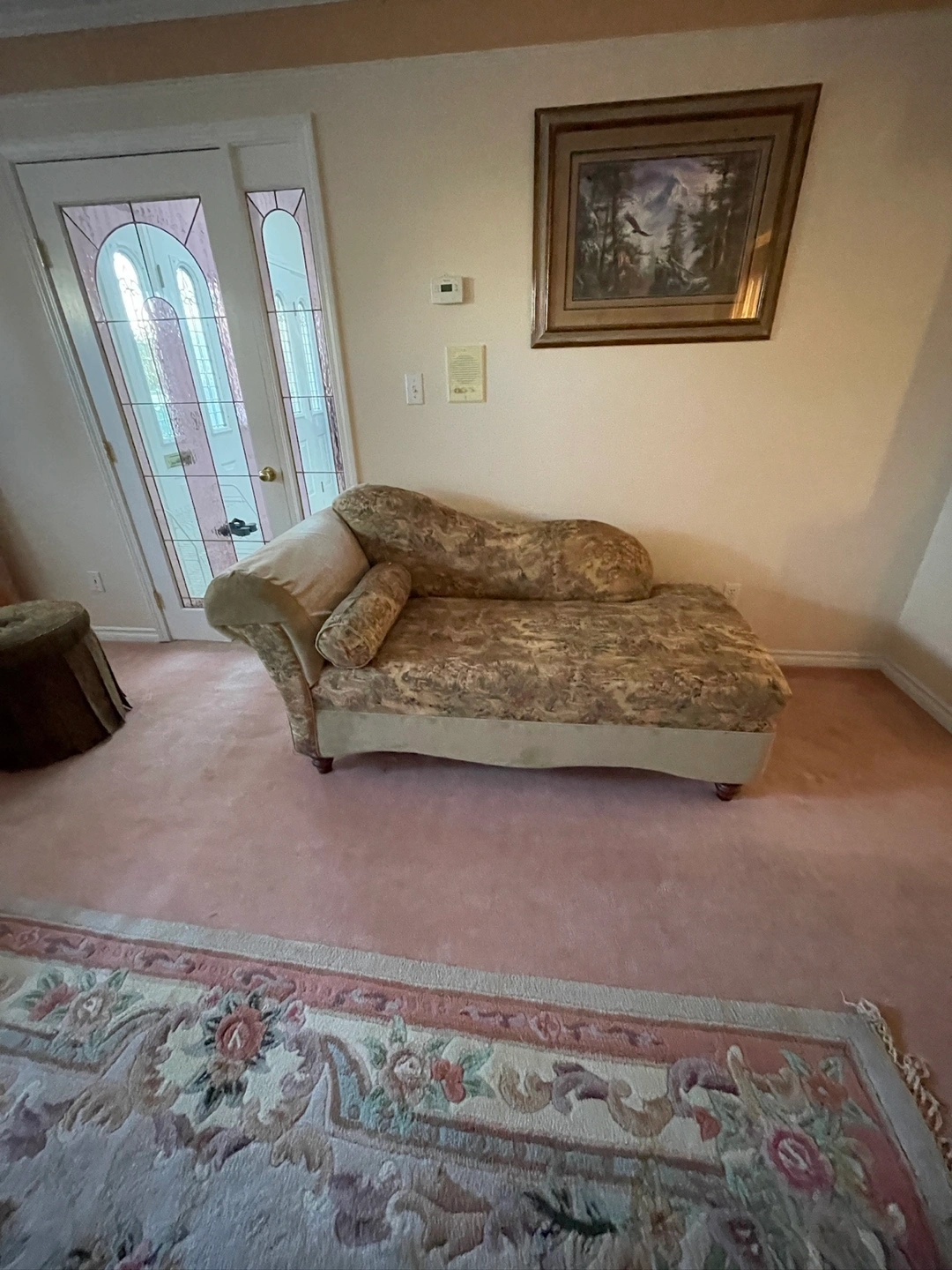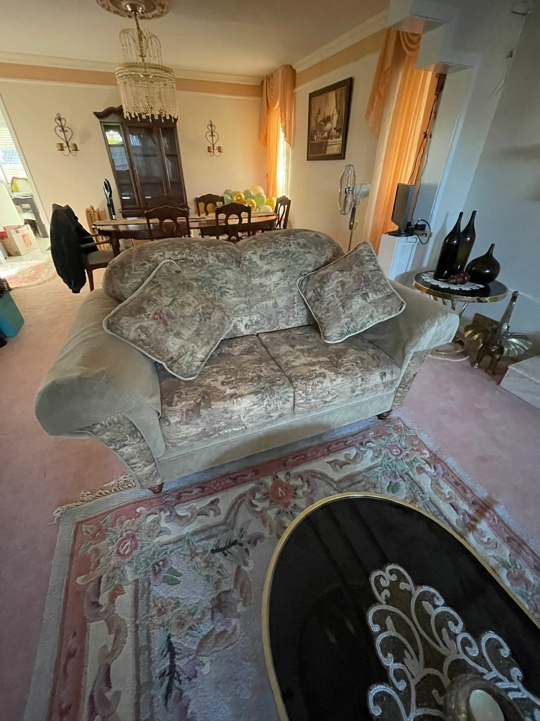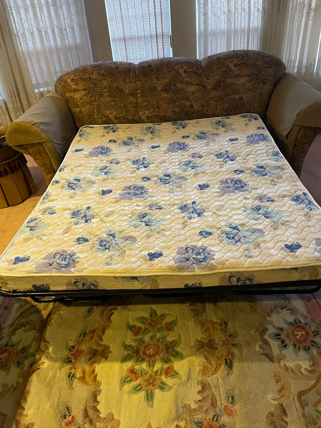 Selling a sofa set with a floral pattern. The set includes a sofa (opens to a bed) and a chaise lounge. The sofa has multiple cushions. The fabric appears to be in good condition.