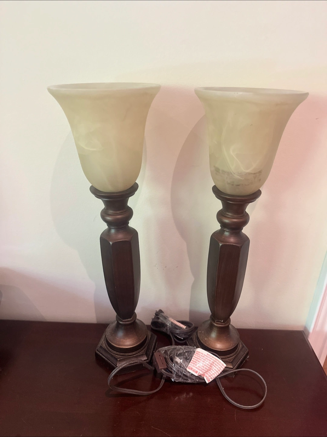 Selling a pair of table lamps, They feature a bronze-coloured base and a lovely, soft white shade. They're in great condition and ready to brighten up your space The light are adjustable. $15 for each $25 for a pair