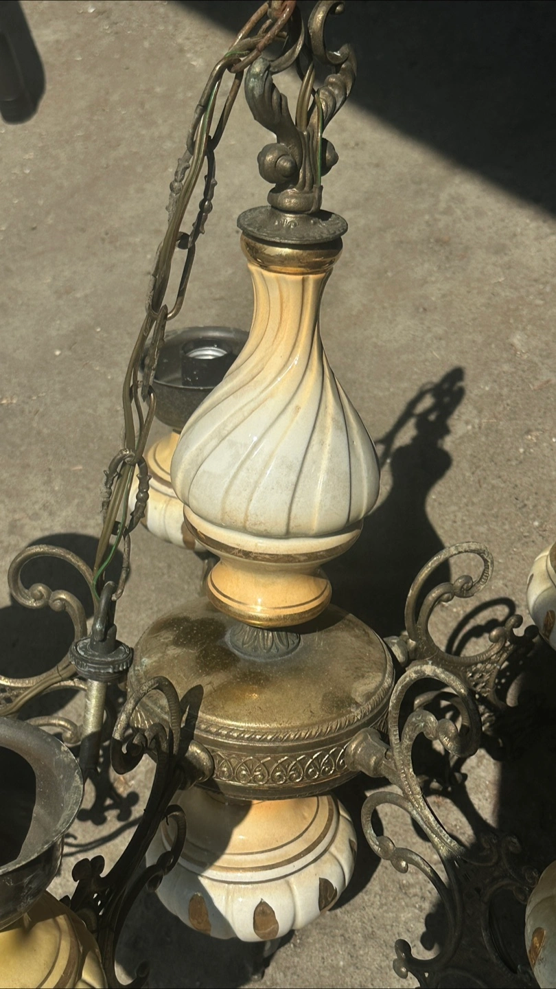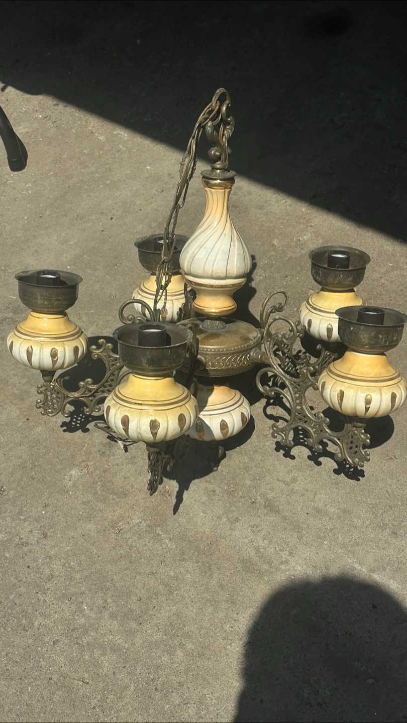 Selling a vintage chandelier. It has a unique design with cream and gold accents. It would make a great addition to any room