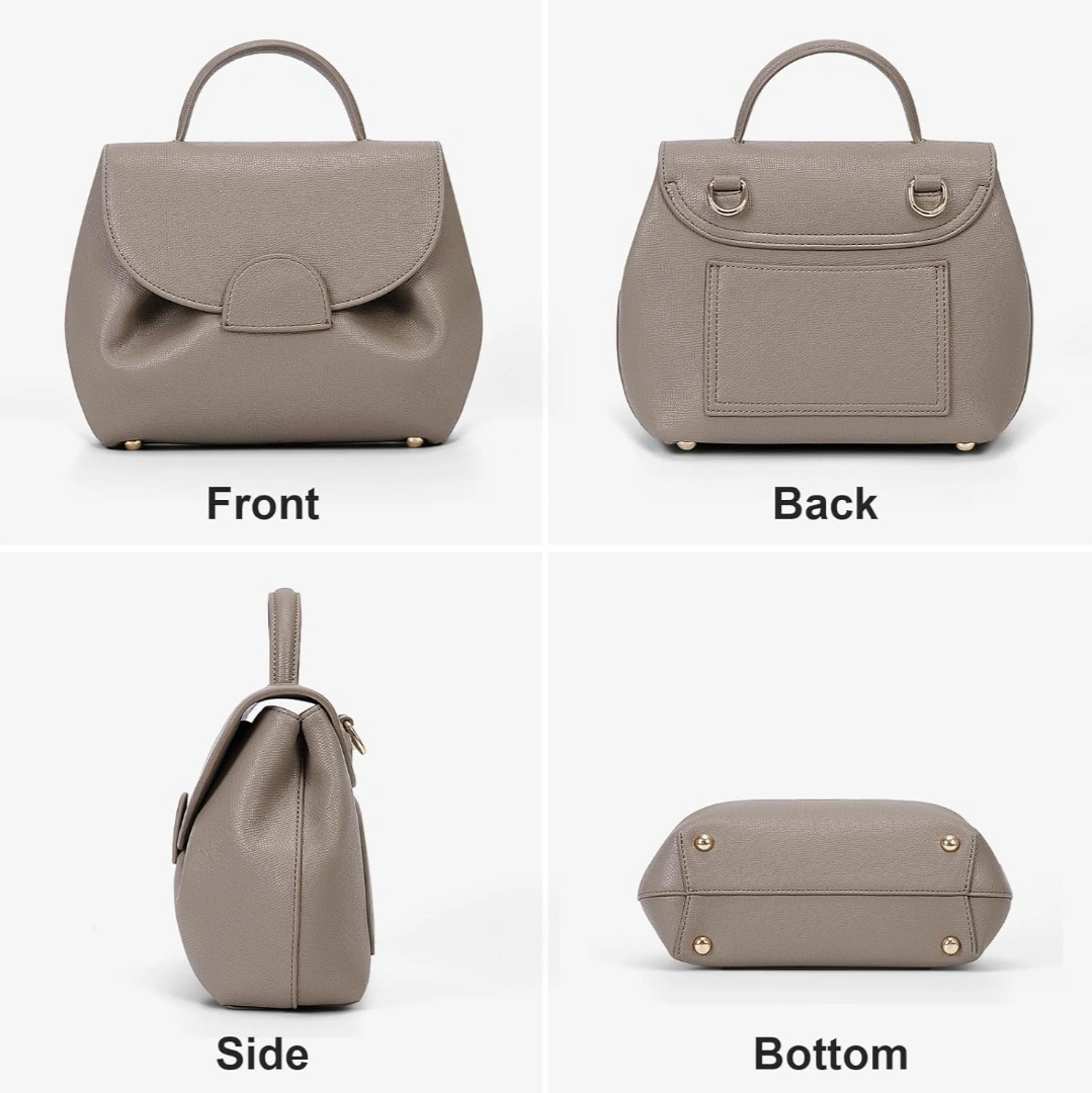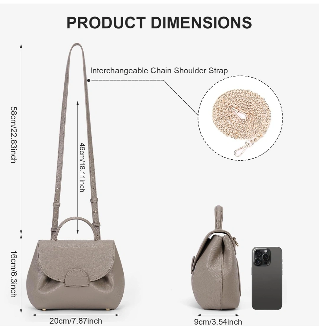 This stylish grey leather top handle bag is in great condition! It features an interchangeable chain shoulder strap. The bag's dimensions are approximately 20cm (7.87 inches) in length, 9cm (3.54 inches) in width, and 16cm (6.3 inches) in height. Perfect for adding a touch of elegance to any outfit