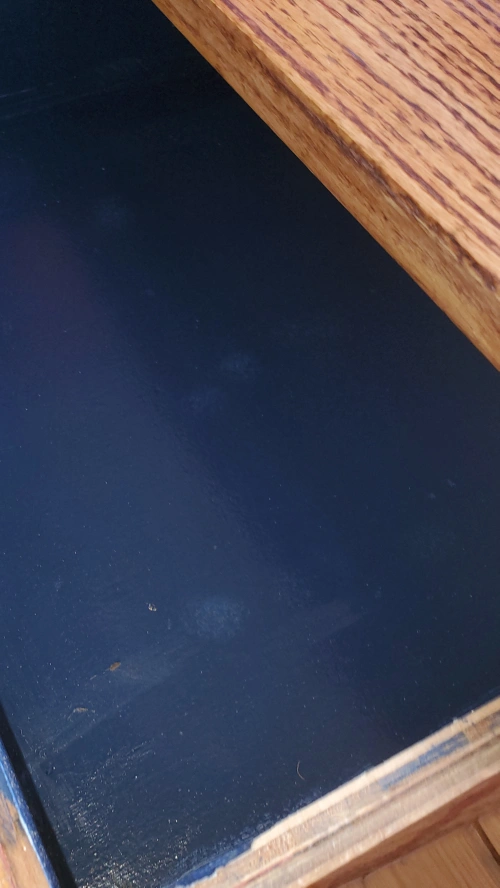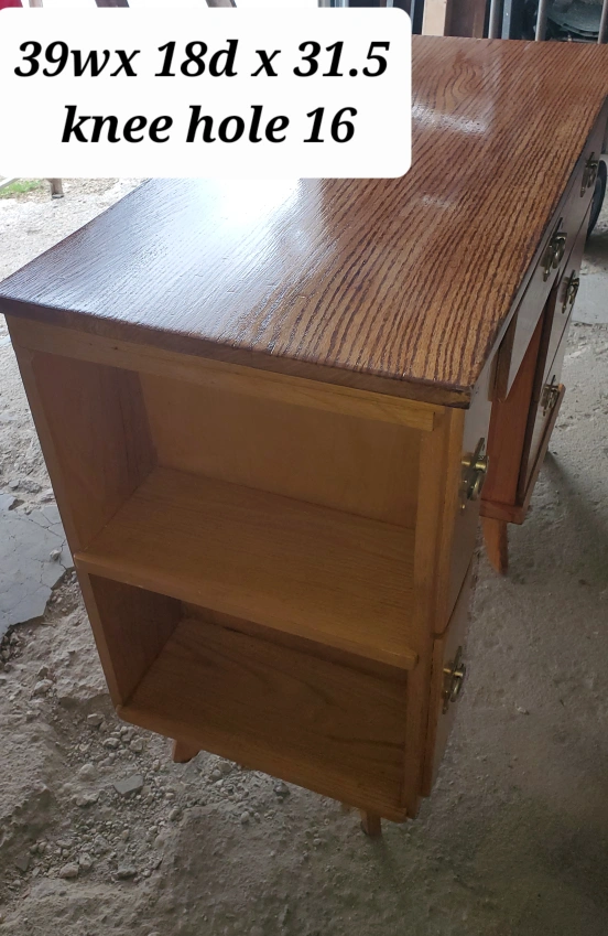 Selling a wooden desk that features drawers on one side and a bookshelf on the other. It has a knee hole of 16 inches. The desk's dimensions are approximately 39 inches wide, 18 inches deep, and 31.5 inches high this is a vintage mcm solid oak desk.