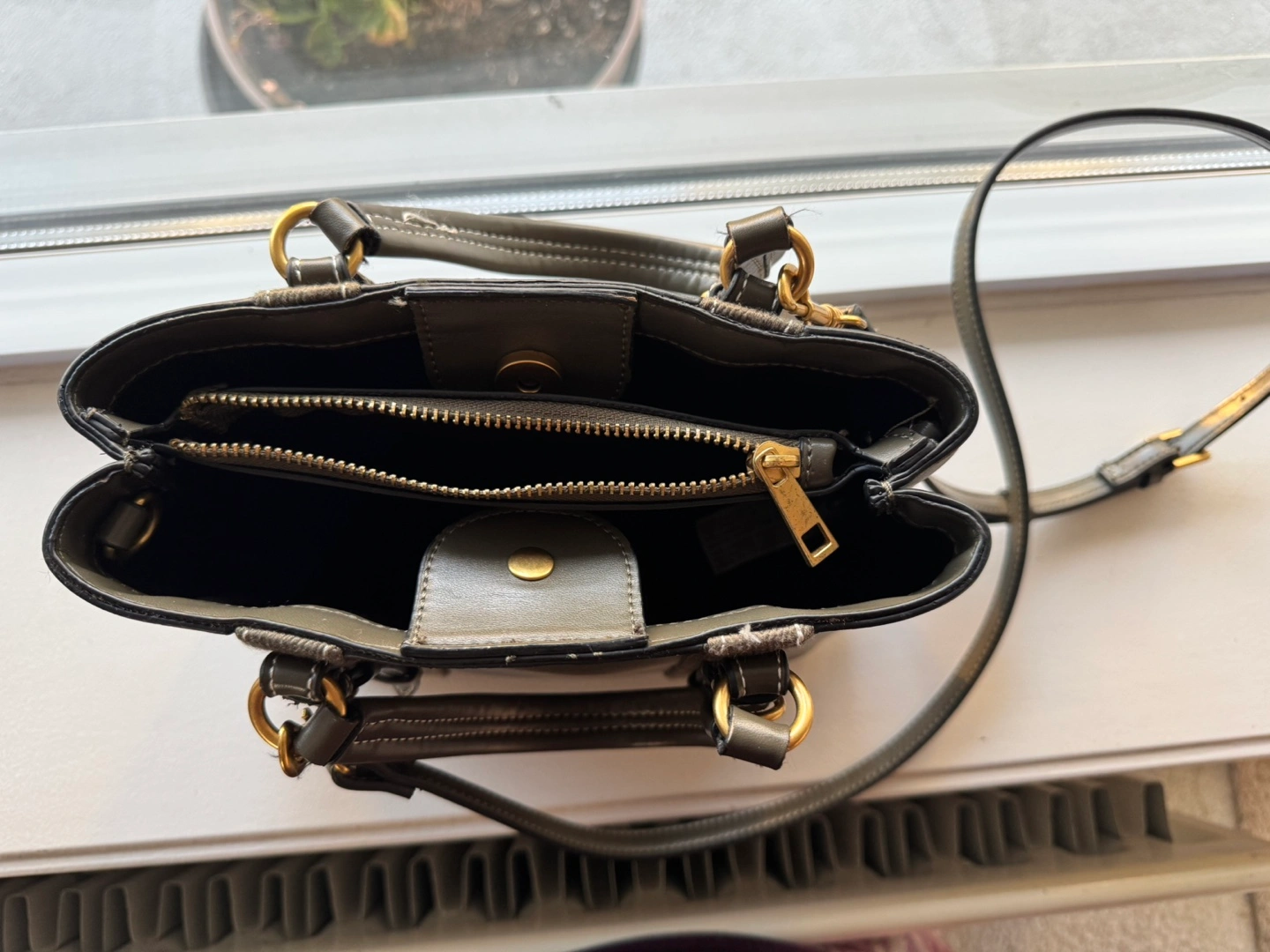 Stylish and versatile mini tote in rich olive green. Features smooth leather finish with a detachable shoulder strap for crossbody wear. Interior includes 3 open pockets for easy organization. Perfect for everyday essentials.