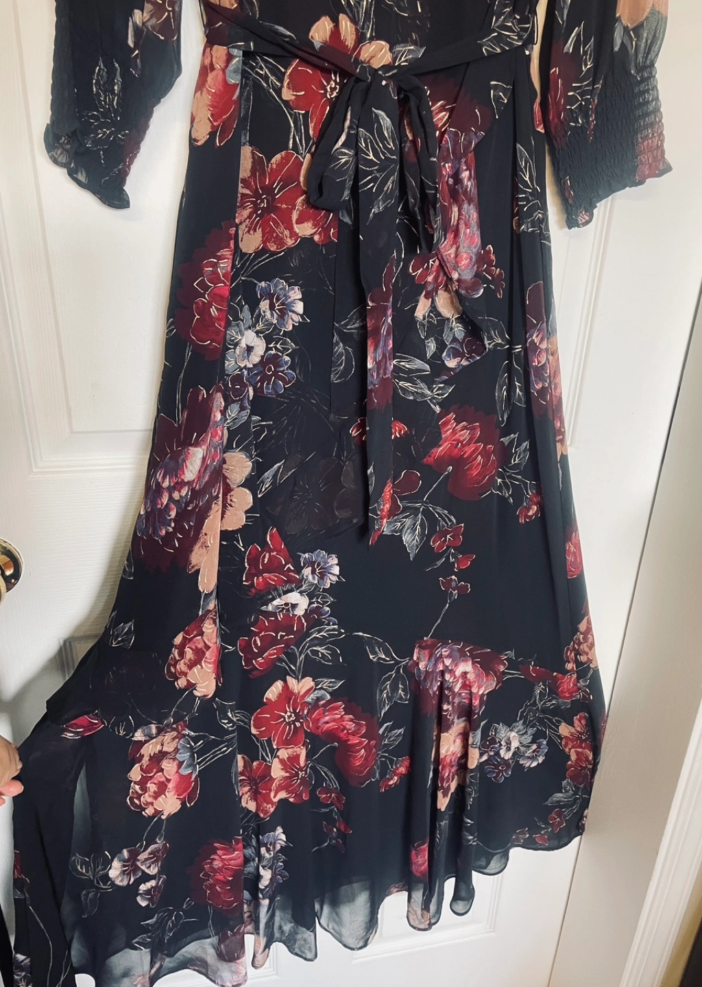 This is a beautiful floral print maxi dress from Taylor Dresses. It features long sleeves with smocked cuffs, a V-neckline, and a flattering wrap silhouette with a self-tie belt. Perfect for any occasion!pick up only thanks