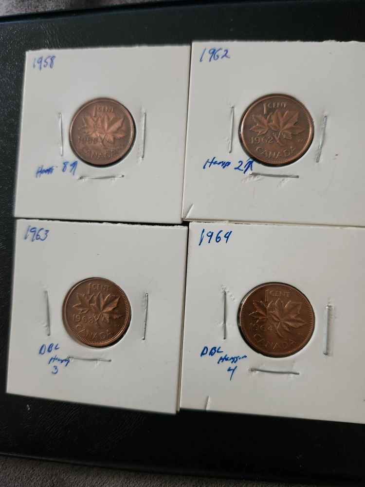 Selling a collection of vintage Canadian pennies! The collection includes pennies from the years 1958, 1962, 1963, and 1964. Each penny is individually mounted and in good condition for its age. A great addition to any coin collection! they all have a hanging date .