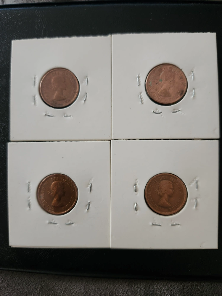 Selling a collection of vintage Canadian pennies! The collection includes pennies from the years 1958, 1962, 1963, and 1964. Each penny is individually mounted and in good condition for its age. A great addition to any coin collection! they all have a hanging date .