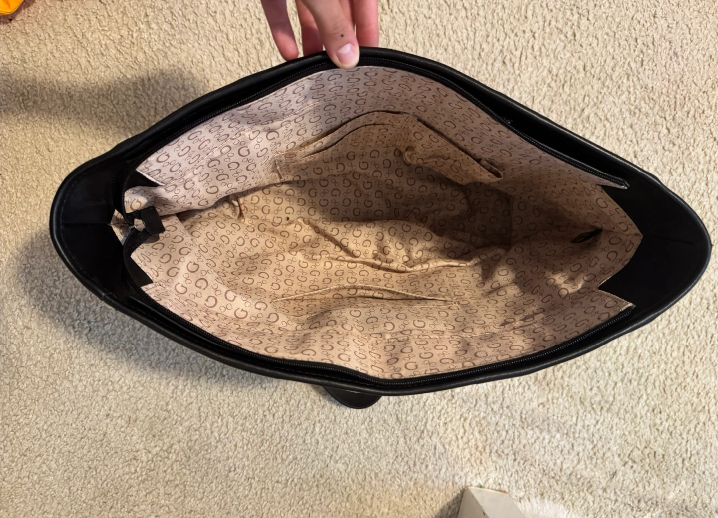 Stylish and spacious GUESS tote in classic beige and black. Features 3 side pockets for easy access to your essentials. Great for everyday use—both functional and fashionable.