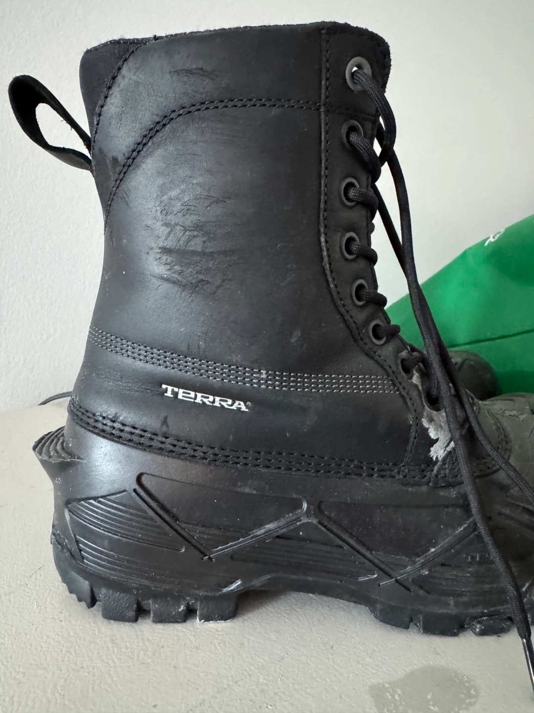 Selling a pair of black Terra work boots. They have some signs of wear from using them once in the snow this past winter but still have lots of life left in them. They feature 3M Thinsulate insulation to keep your feet warm and dry in up to -40 Weather. Bought Them Brand New For $300 At Work Authority Pickup on Chandler Drive. Must pickup within 24 hours of messaging or will move onto the next available person.