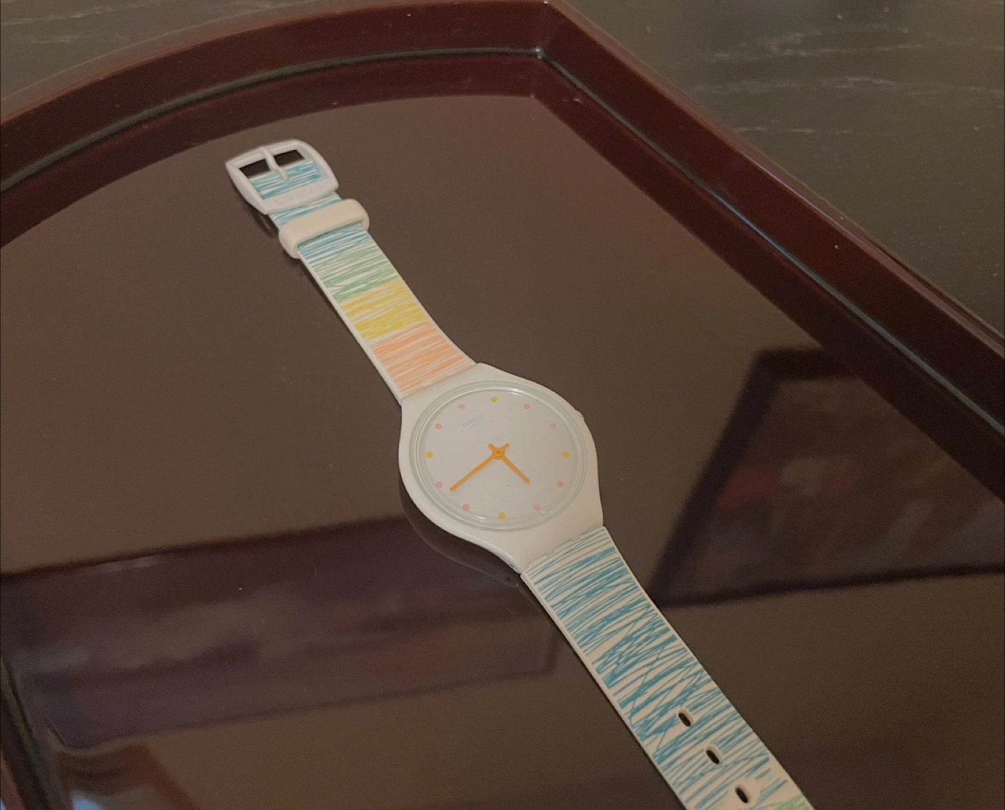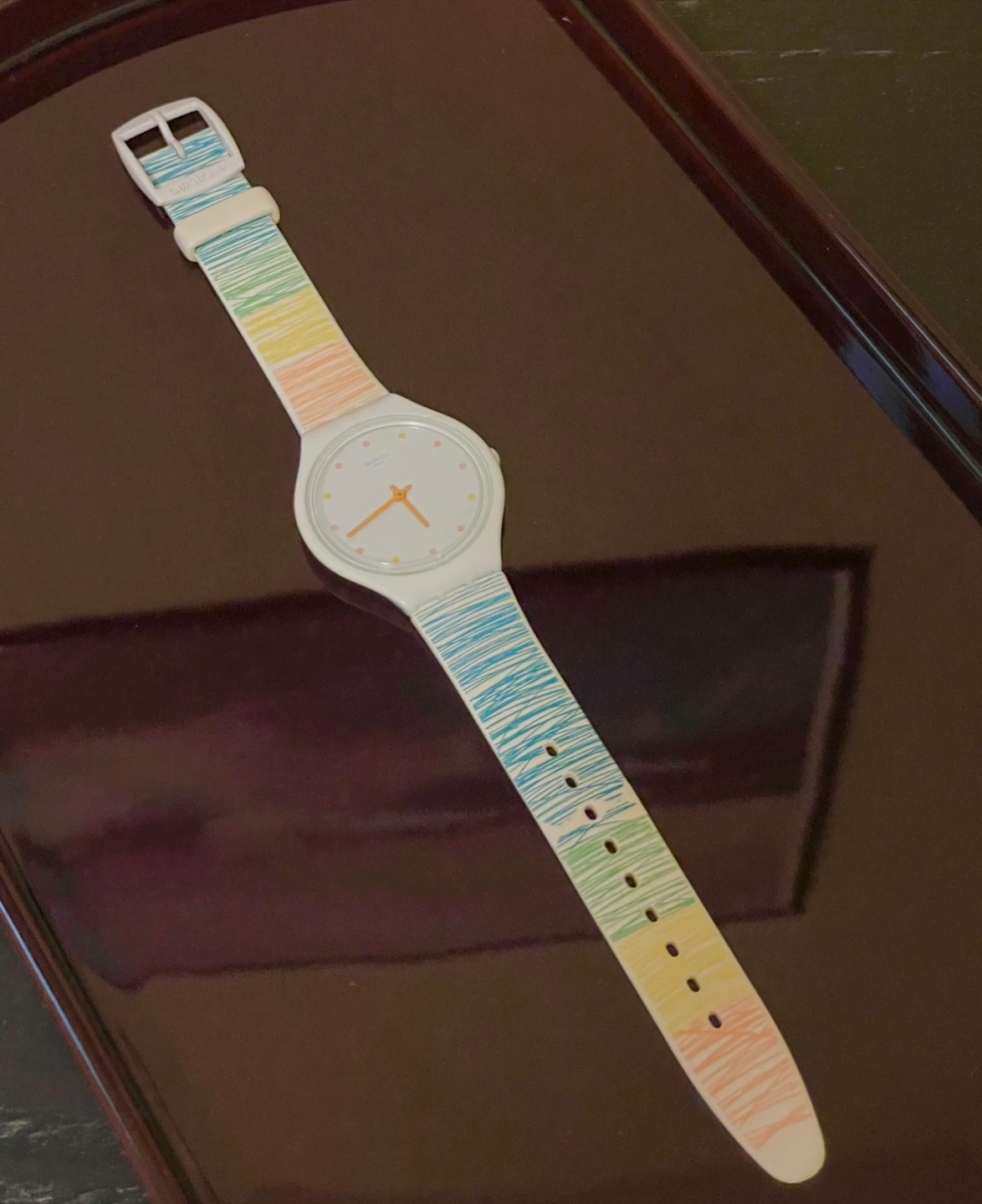 11Unisex, white and rainbow casual watch -Watch Size: 34mm round case with push/pull crown Strap width 16mm, length 240mm -Water Resistance: 100 Feet