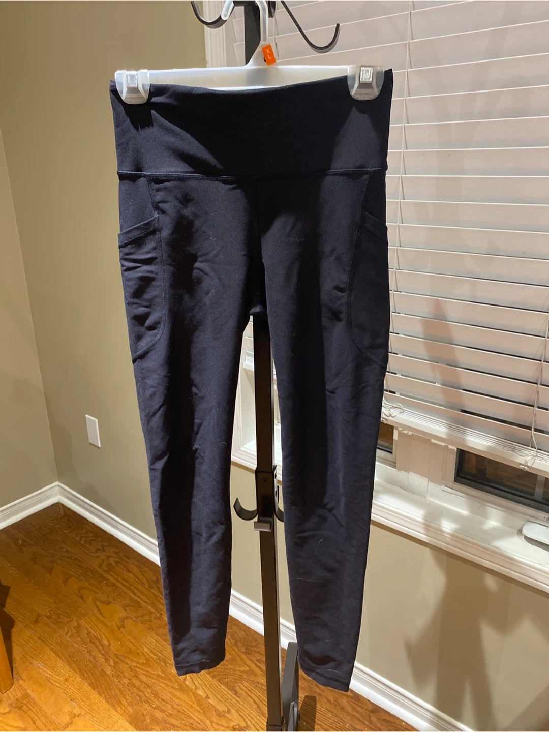 These are Old Navy black cropped leggings with side pockets. They're made from PowerSoft fabric for comfort and flexibility. Perfect for everyday wear or your next workout!