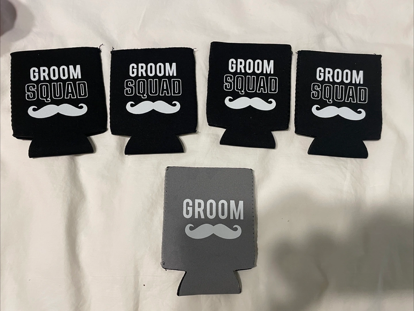 Selling a set of fun accessories for a groom and his squad, perfect for a bachelor party! Includes can coolers with a mustache design, a "Groom" captain's hat, and a Groom’s customised sash.