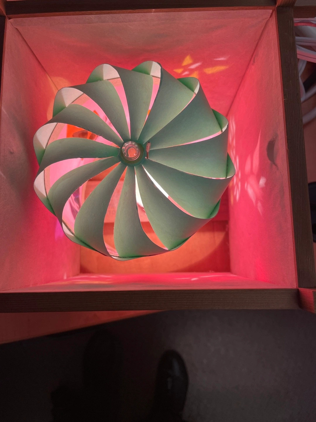 Selling a cute table lamp 8” by 8” square) with a wooden frame! It gives off a warm, ambient light, perfect for a bedside table or desk. The lamp has a unique design with floral patterns on the shade.