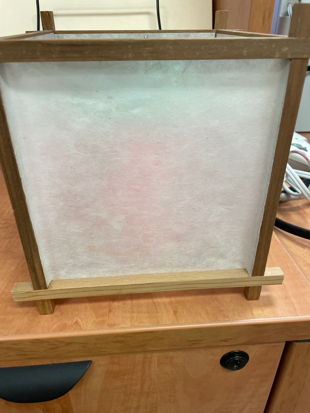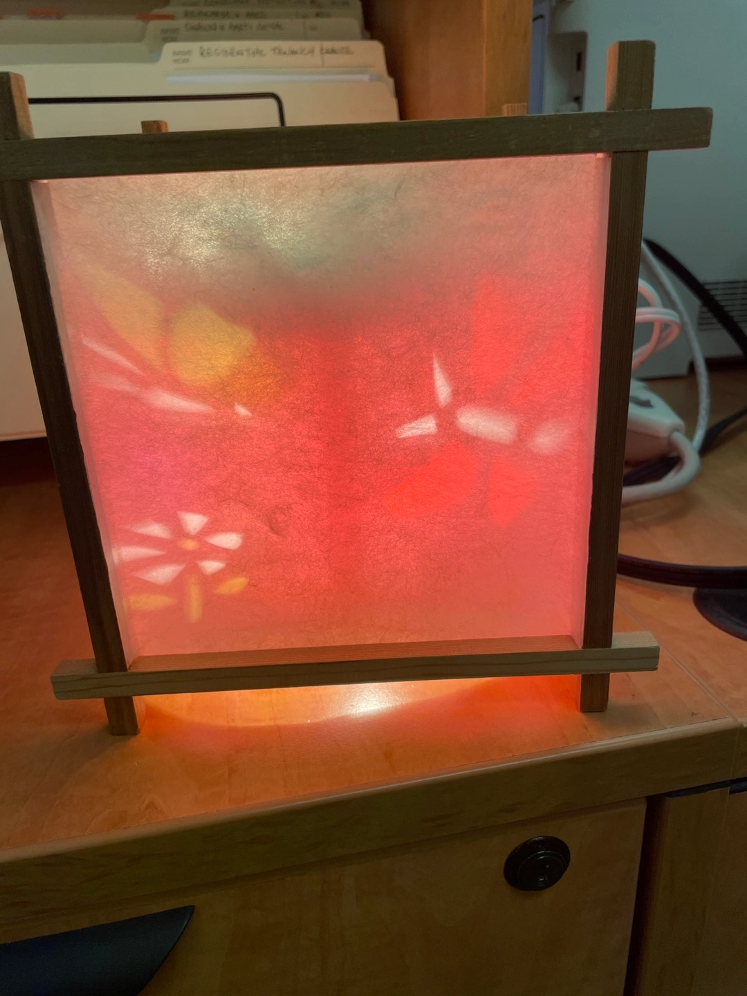 Selling a cute table lamp 8” by 8” square) with a wooden frame! It gives off a warm, ambient light, perfect for a bedside table or desk. The lamp has a unique design with floral patterns on the shade.