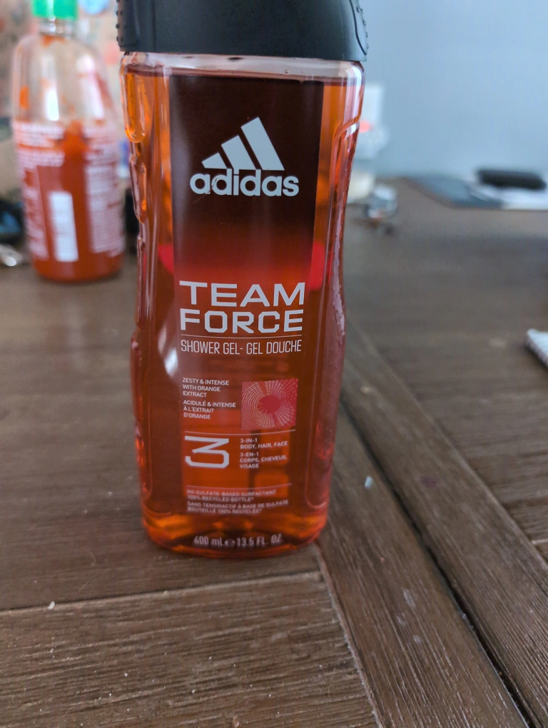Selling a bottle of Adidas Team Force shower gel. It's a 3-in-1, so you can use it for your body, hair, and face! It has a zesty and intense orange extract
