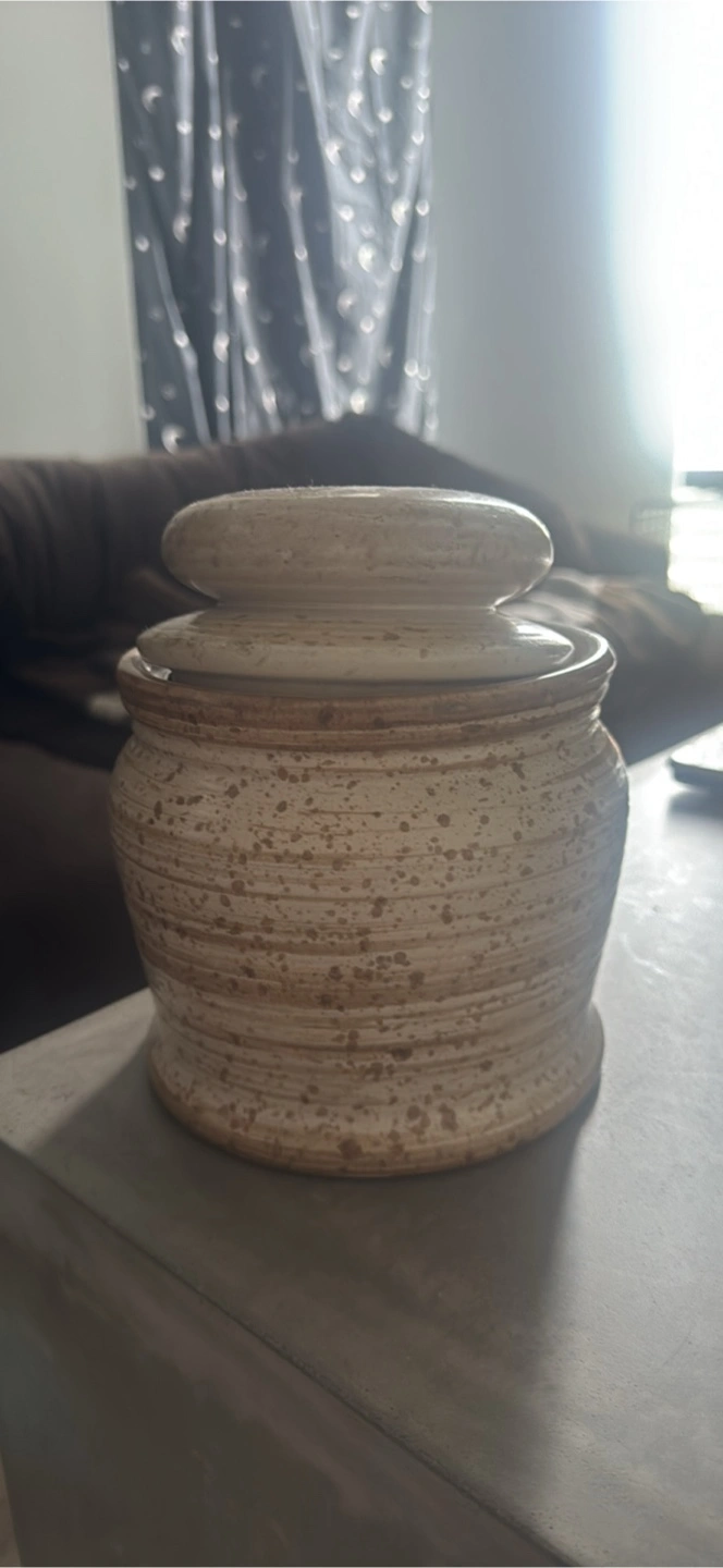 Selling a cute speckled ceramic jar with a lid. It's in great condition and perfect for storing small items or adding a touch of rustic charm to your decor