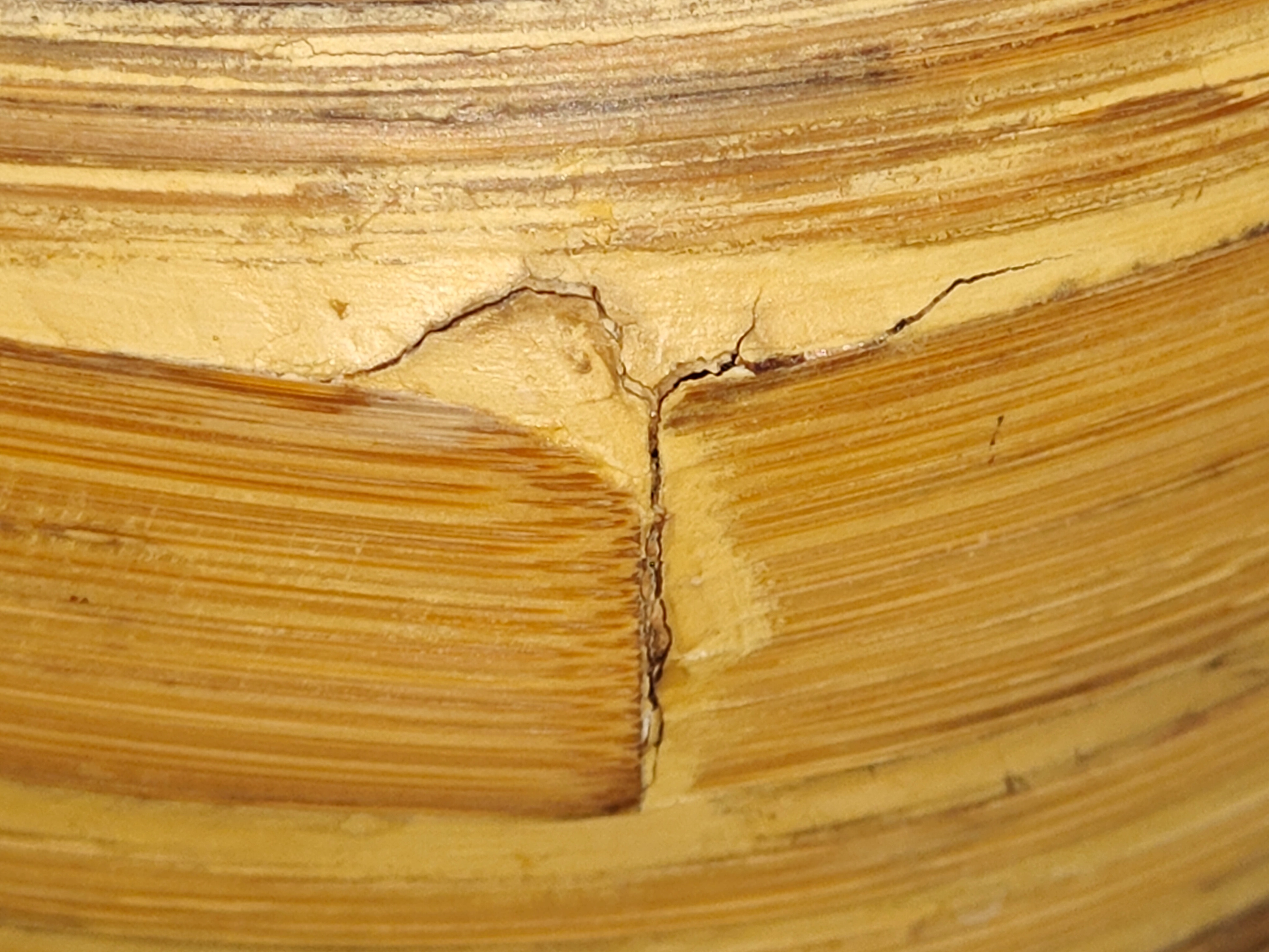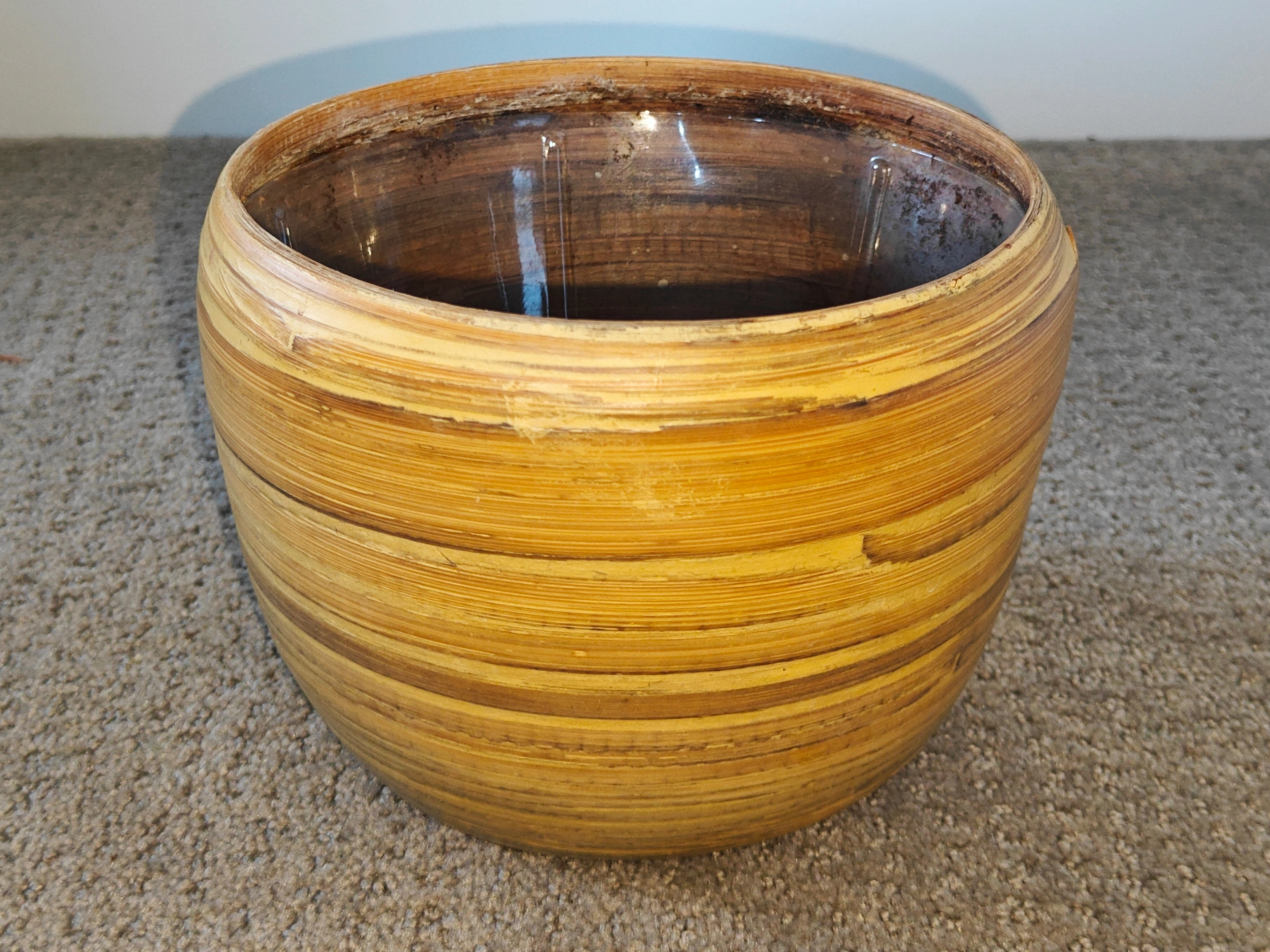 Condition NOTE: There is a visible crack on one section of the outer bamboo (see photos for detail). This does not affect the functionality of the inner plastic liner or integrity of the pot.