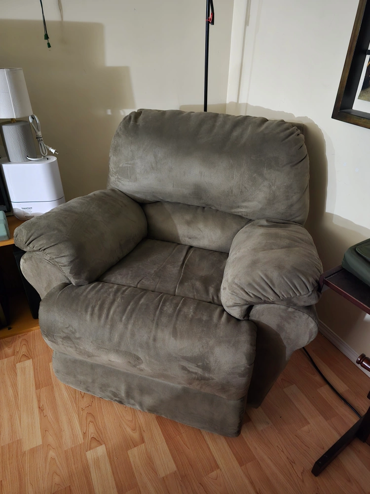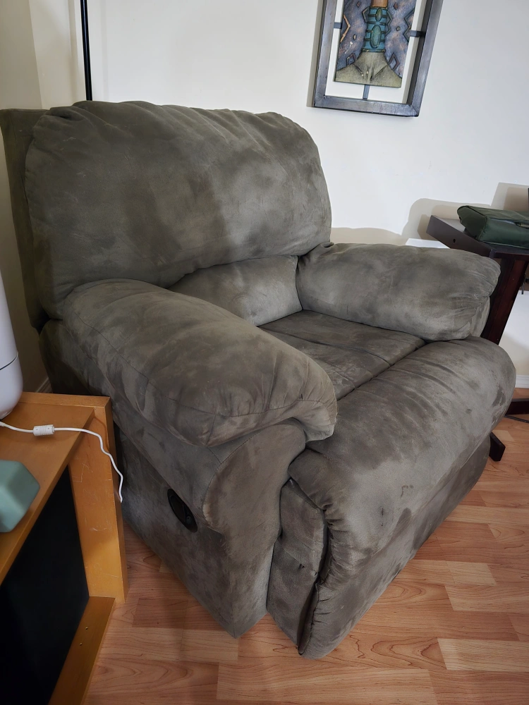 Looking for a comfy spot to relax? This recliner is in great shape and ready for a new home! It's perfect for kicking back after a long day. The fabric is soft and inviting, making it a cozy addition to any living room or den. It's just waiting for you to sink in and enjoy! Manual and light weight