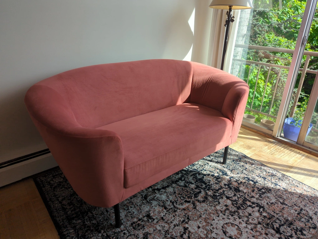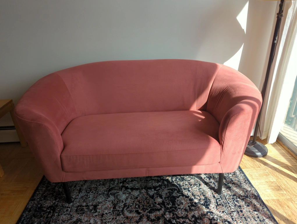 Selling a cute pink loveseat in great condition! It's perfect for a small space or as an accent piece. The colour is a lovely soft pink, and it's super comfy for two people to relax on. It's a great addition to any living room or bedroom