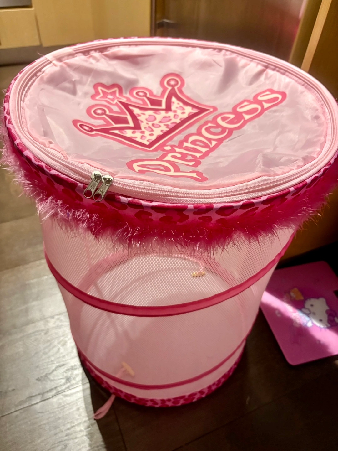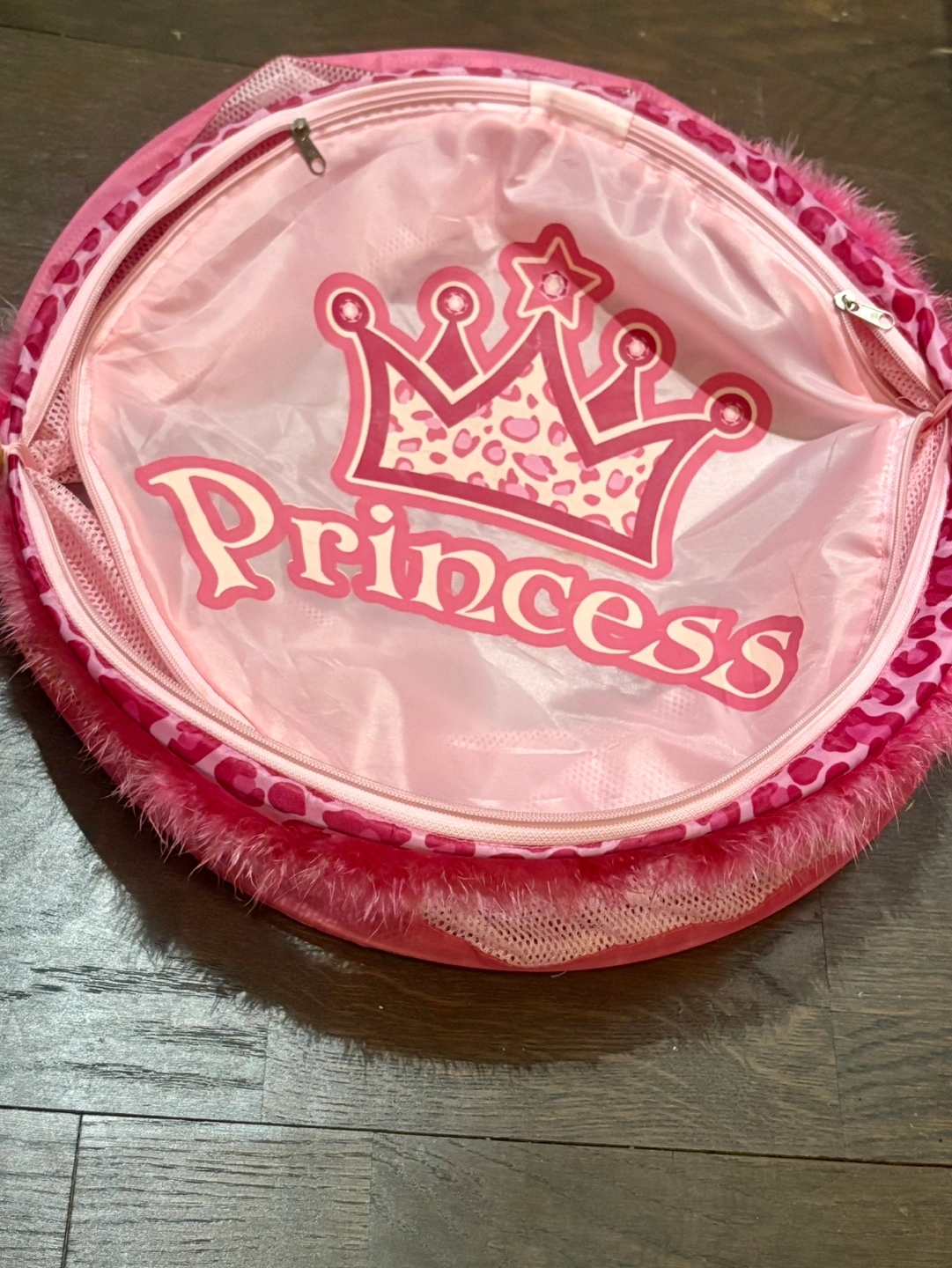 Features a princess crown design and fuzzy pink trim. Collapsible for easy storage.