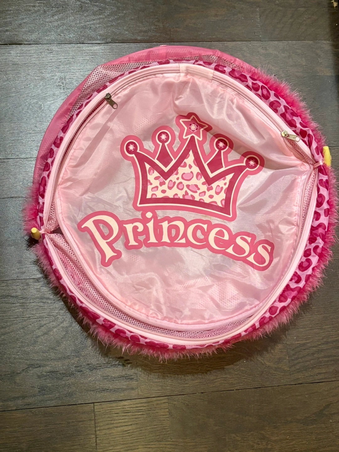 Features a princess crown design and fuzzy pink trim. Collapsible for easy storage.
