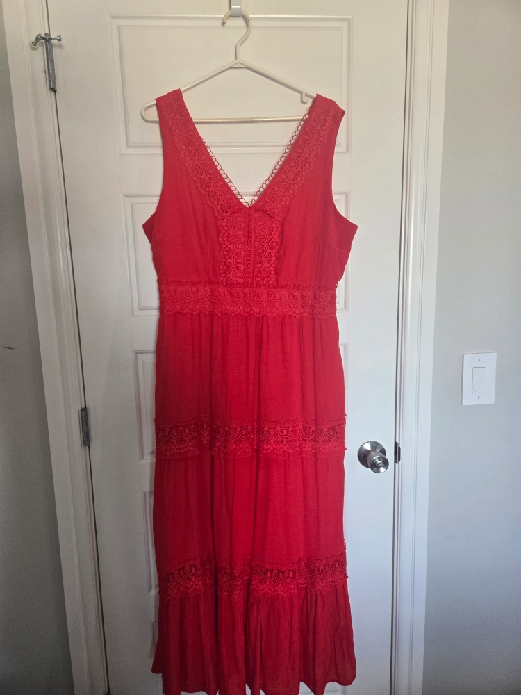 A lovely red maxi dress featuring delicate lace details. It's perfect for a casual summer day or dressing up for a special occasion. The dress is in great condition and ready for a new home!