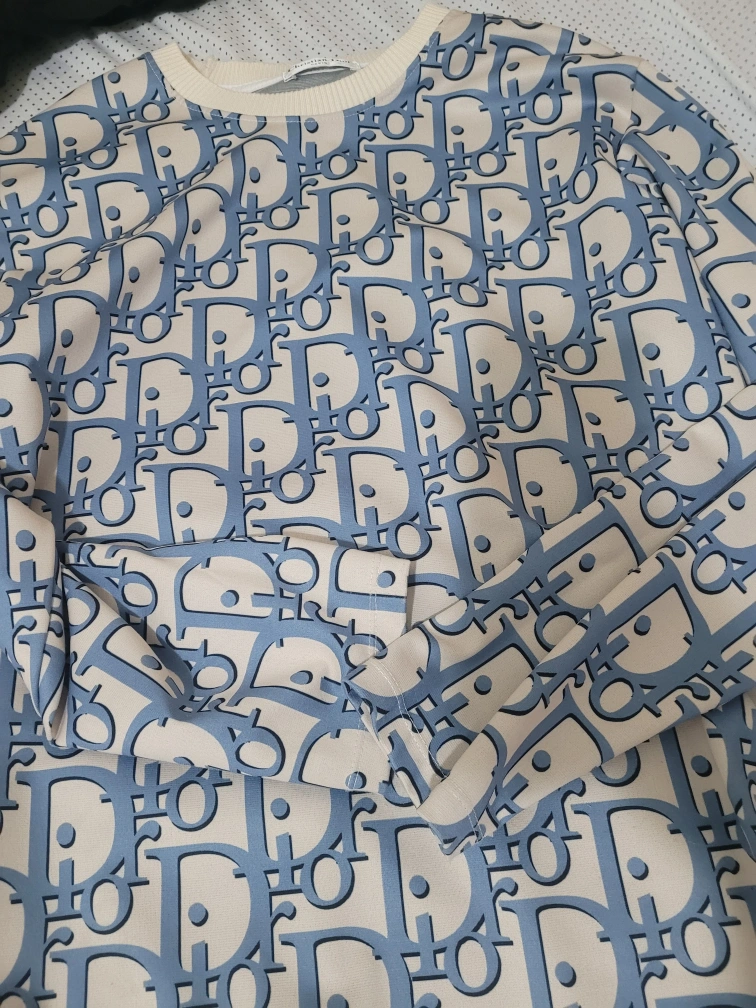 Selling a Dior sweatshirt with an all-over logo print. The main colours are a light cream and a baby blue. It's in great condition and ready for a new home!