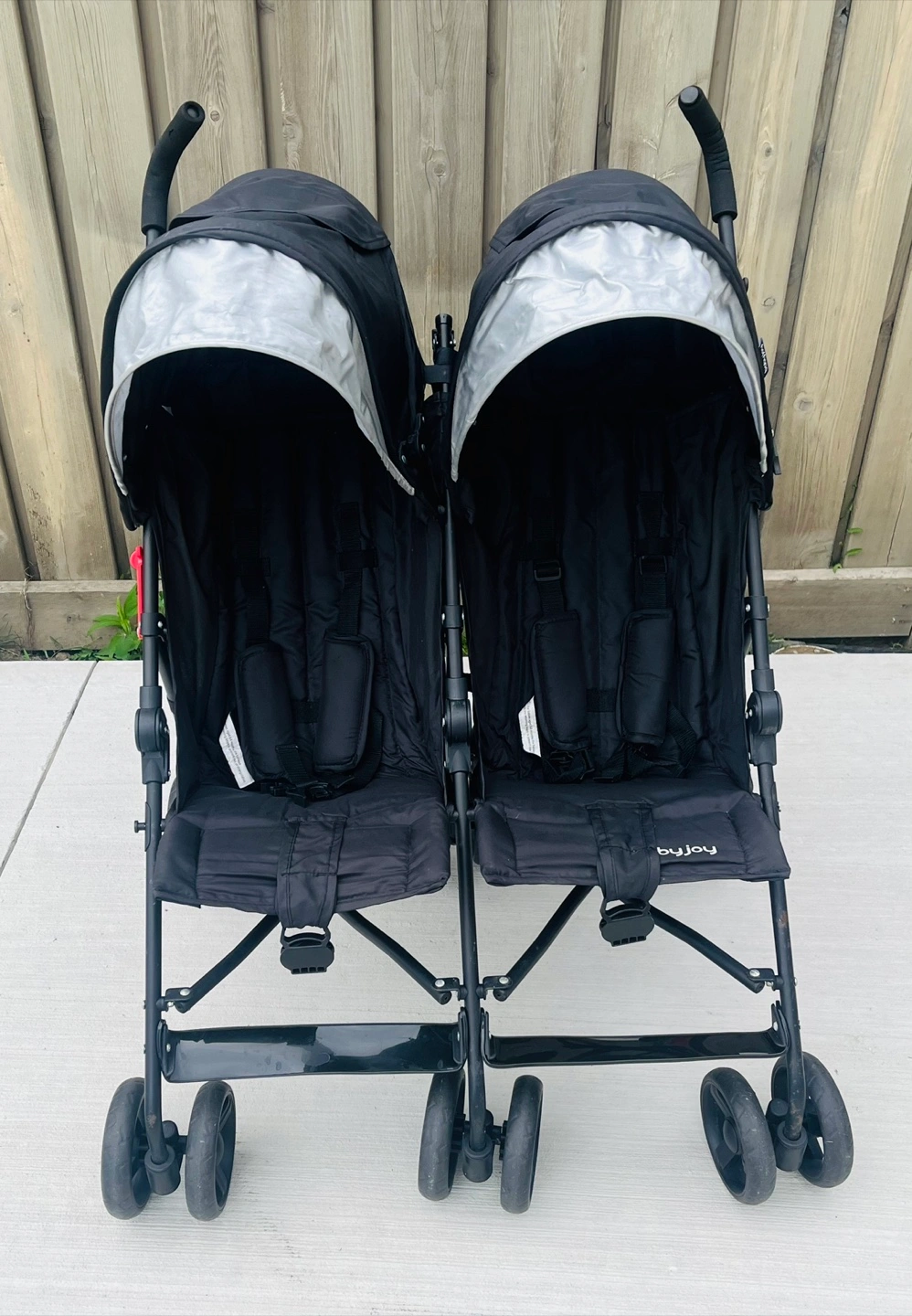 Selling a Baby Joy twin stroller in black! It's in great condition and ready for new adventures with your little ones. Perfect for parents of twins or siblings close in age