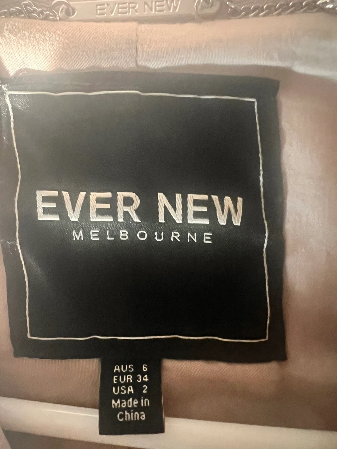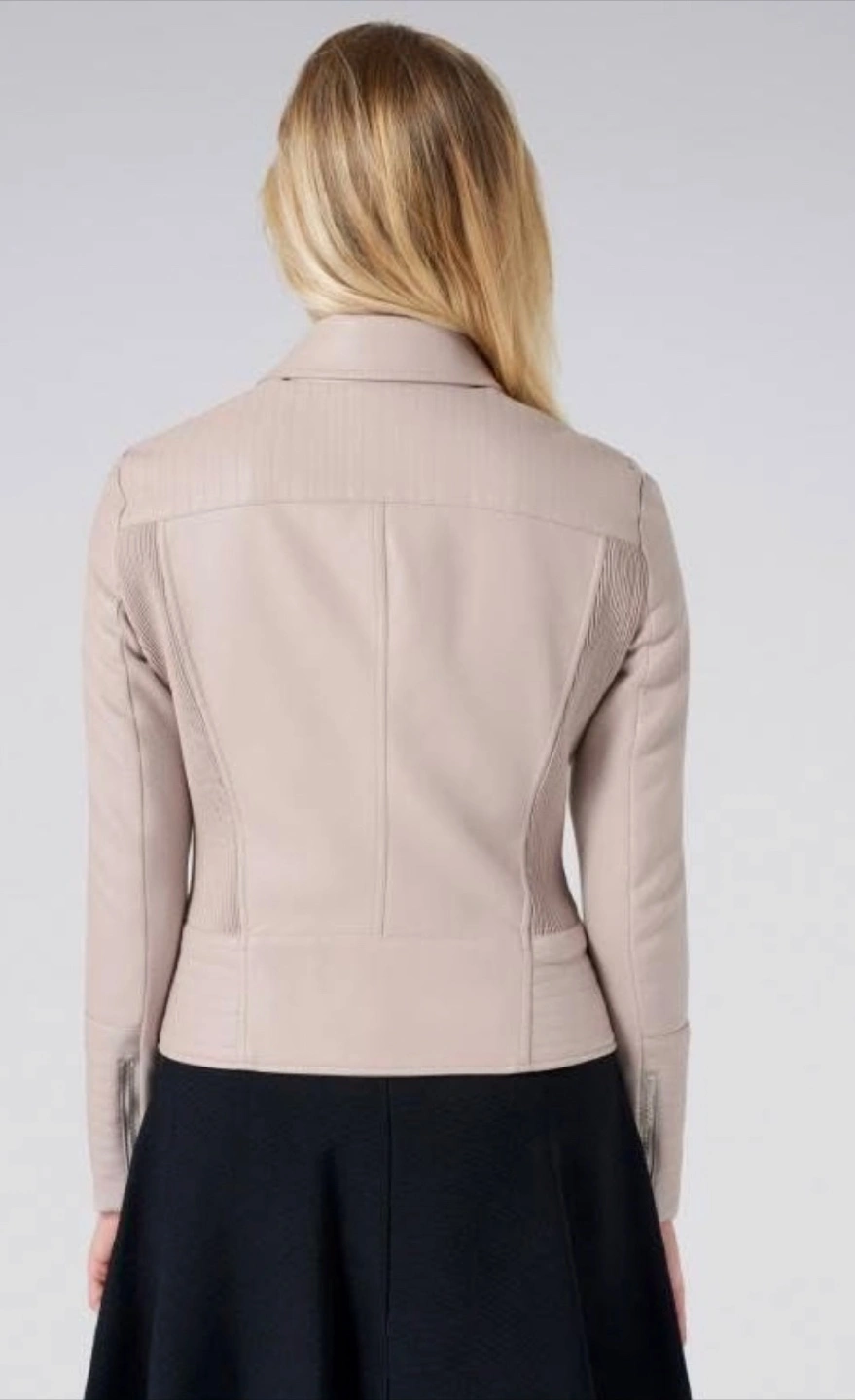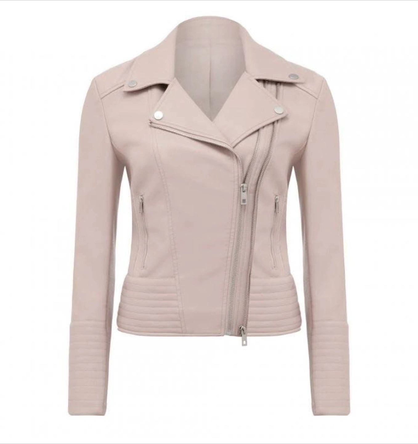 Selling a super cute Ever New Melbourne faux leather biker jacket! It's a size 2 (US sizing). The jacket is a light beige colour and features a classic biker design with zippers and quilted detailing on the sleeves and shoulders.