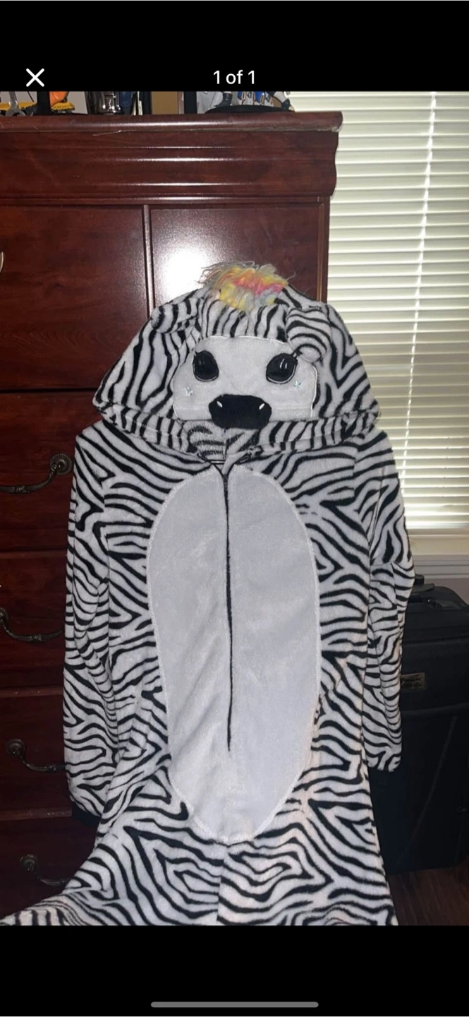 Cozy up in this fun zebra print onesie! Perfect for lounging around the house or adding a playful touch to your sleepwear. It's in great shape and ready for a new home! Cash only