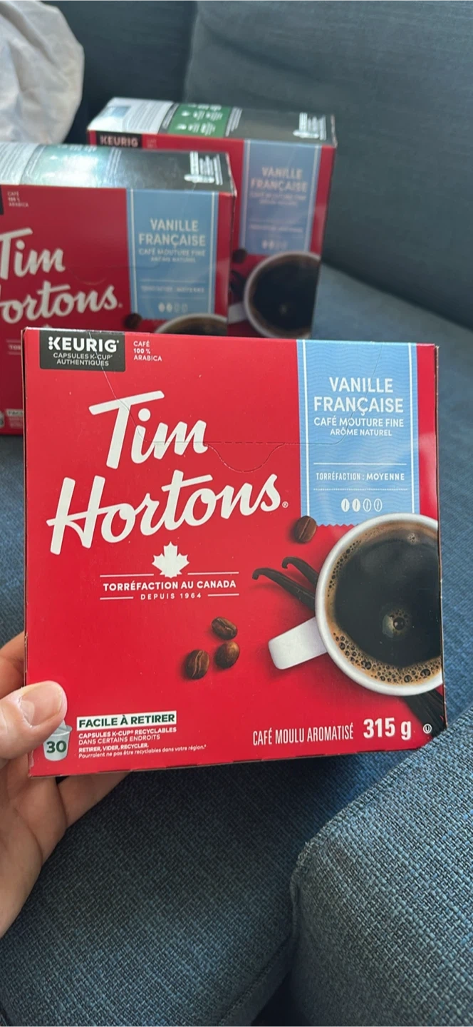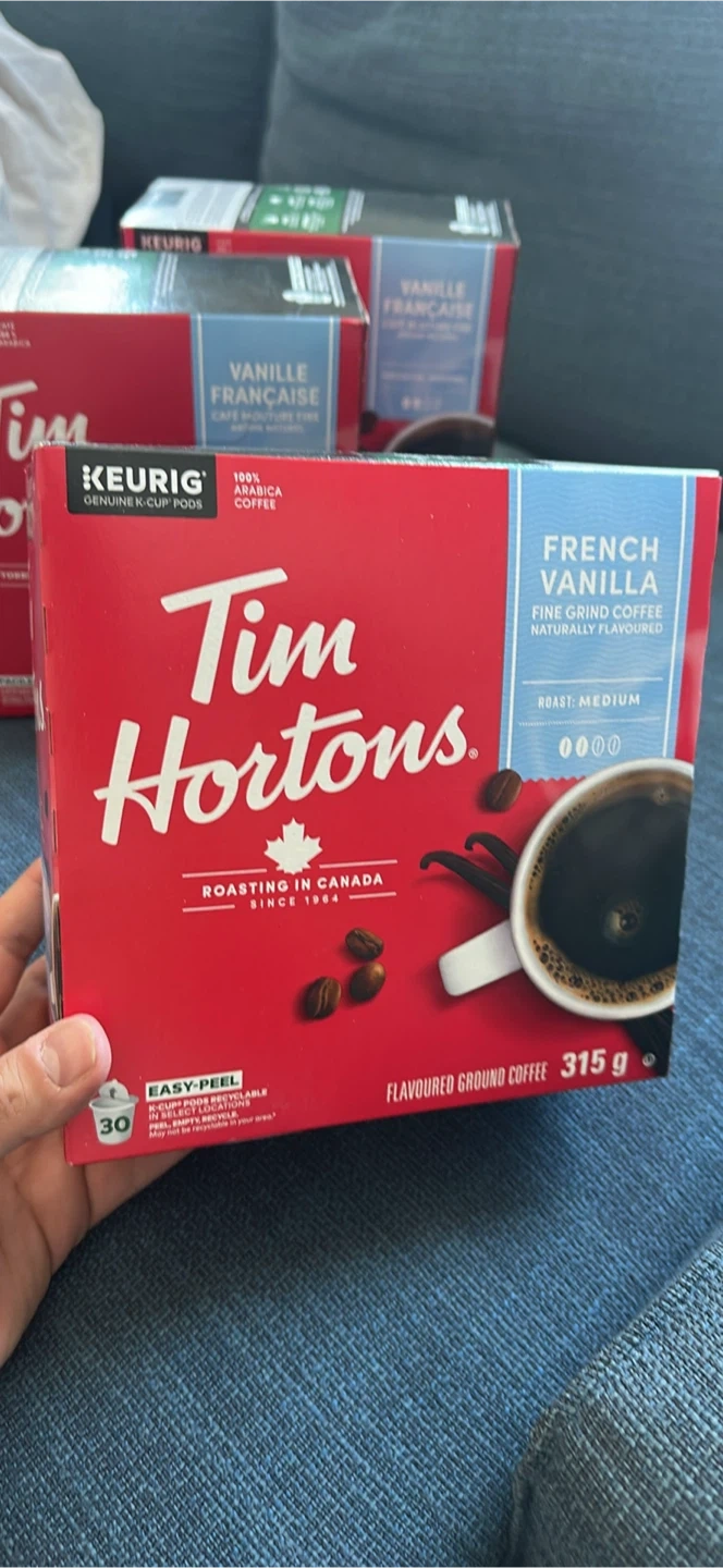 Selling a box of Tim Hortons French Vanilla K-Cups! The box contains 30 K-Cup pods of fine grind coffee with a medium roast. Enjoy the classic Tim Hortons flavour from the comfort of your own home