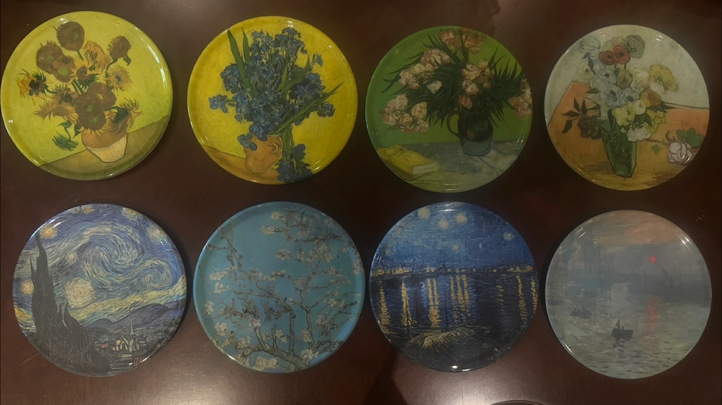 Set of eight decorative plates inspired by Van Gogh paintings. These plates would be a great addition to any home decor. Also included are two cork coasters