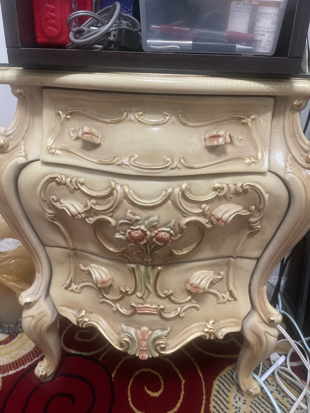 Selling a vintage-style nightstand with ornate detailing. It features three drawers and a unique, elegant design. Perfect for adding a touch of classic charm to your bedroom!