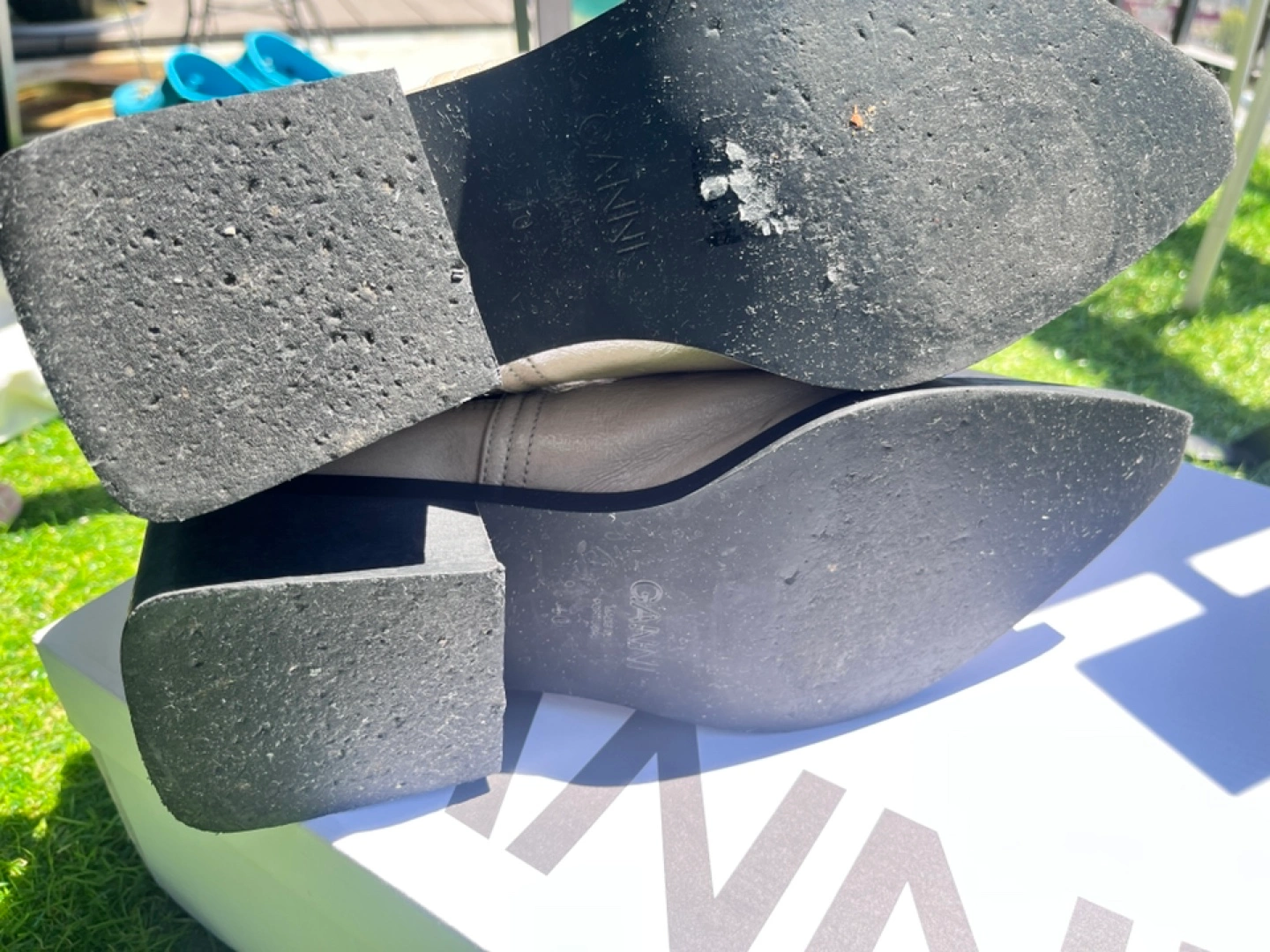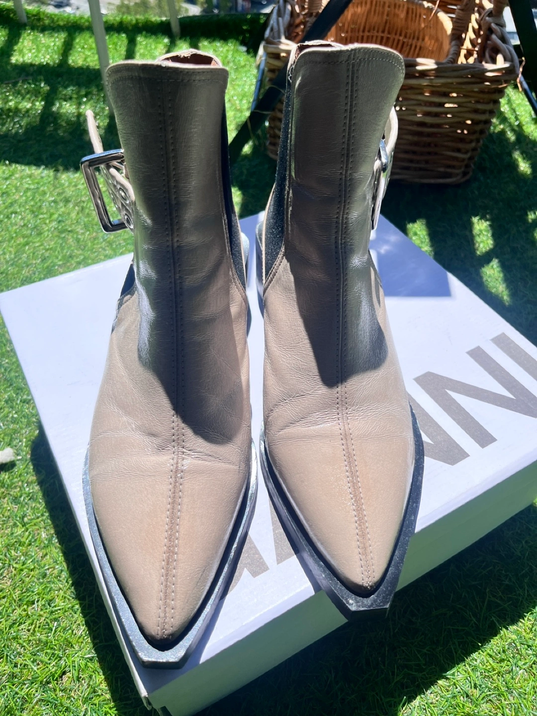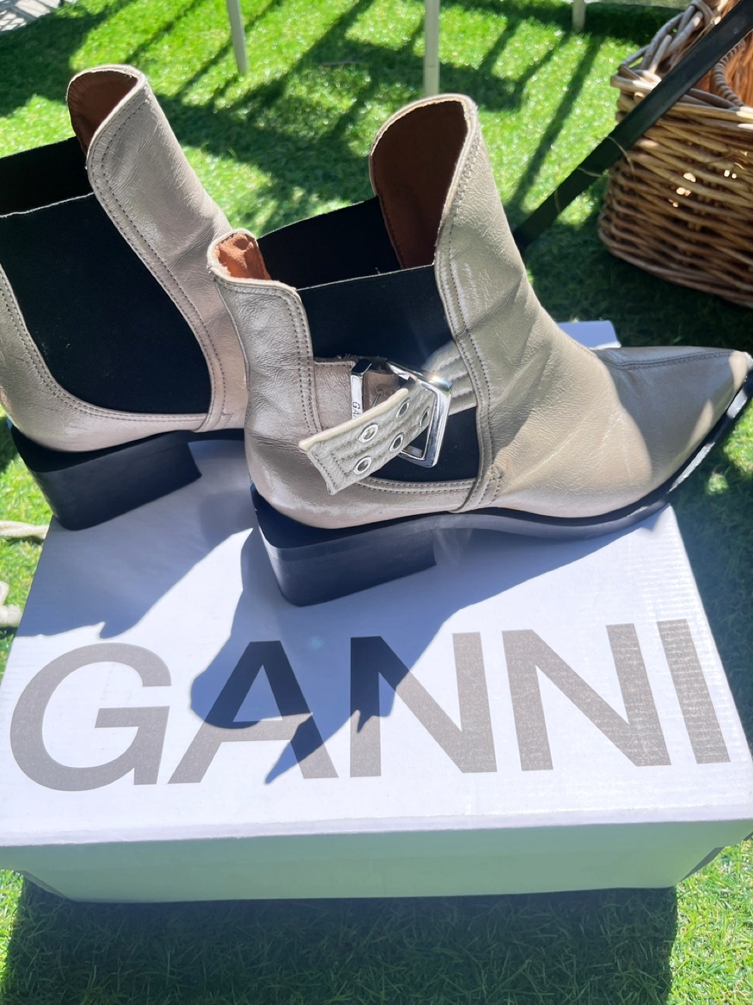 Ganni leather ankle boots in a size 40 They have a unique design with a buckle detail. There are some signs of wear on the soles, but overall they're in good condition. Box included!