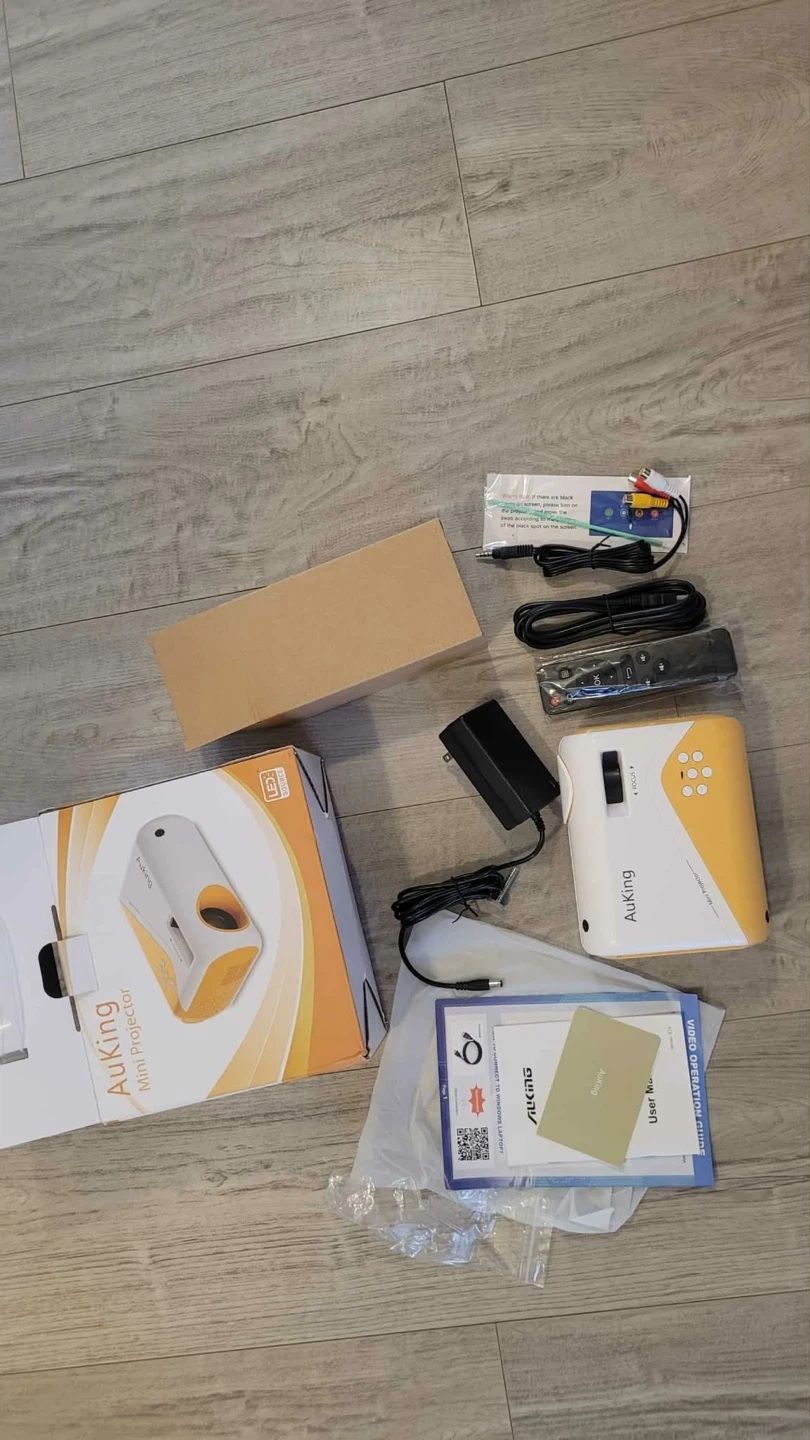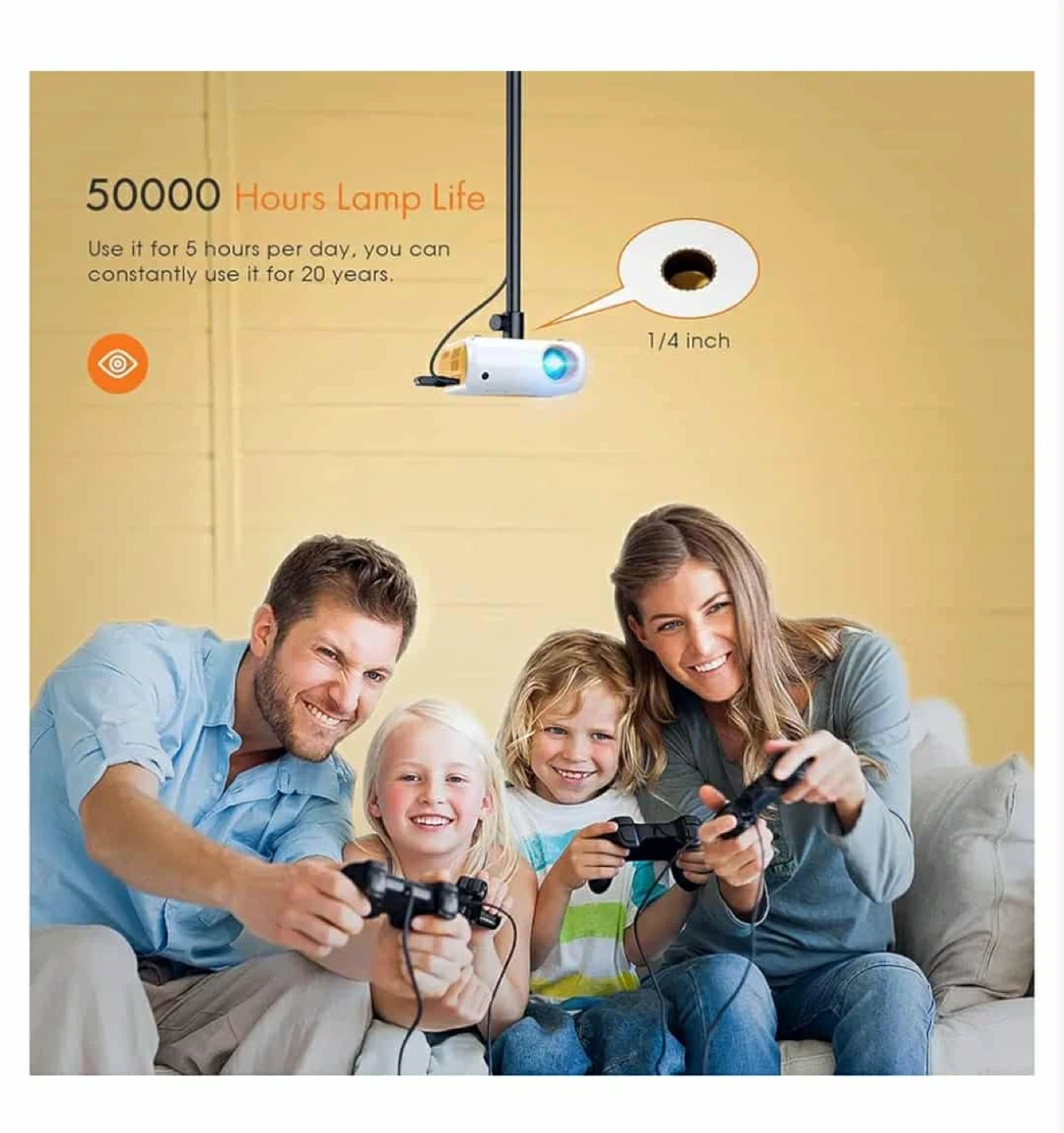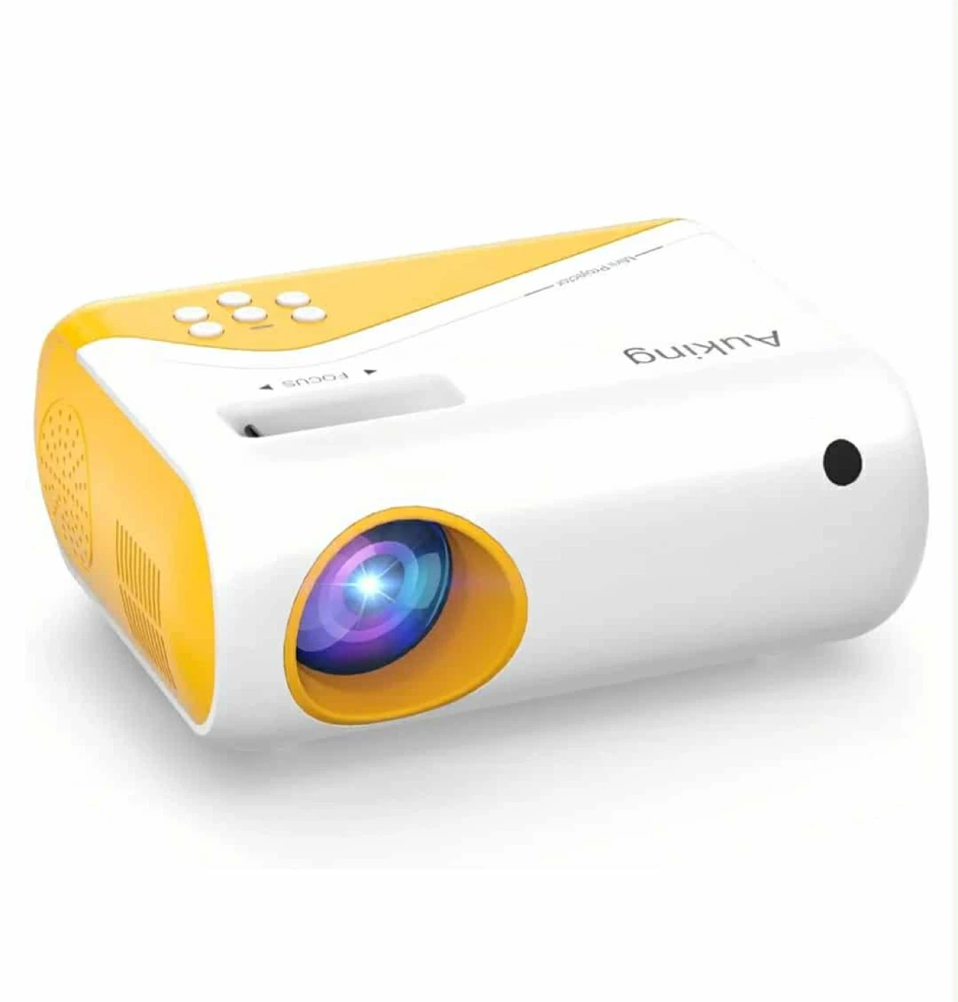 This is an AuKing mini projector. It boasts a lamp life of 50,000 hours. The projector is compatible with multiple devices like smartphones, laptops, and PS4. Its compact size makes it easy to carry around. It projects a screen size up to 170 inches.