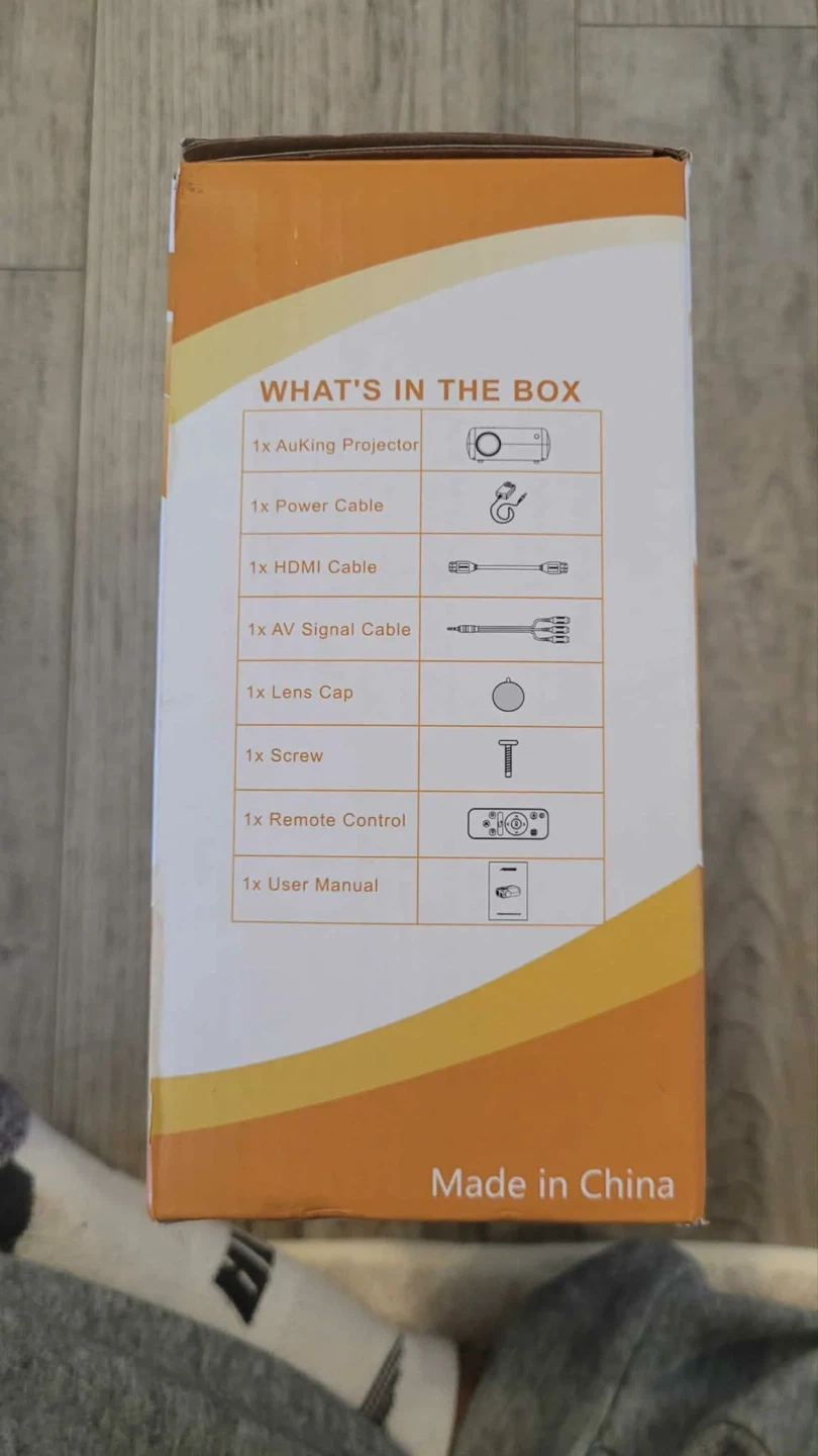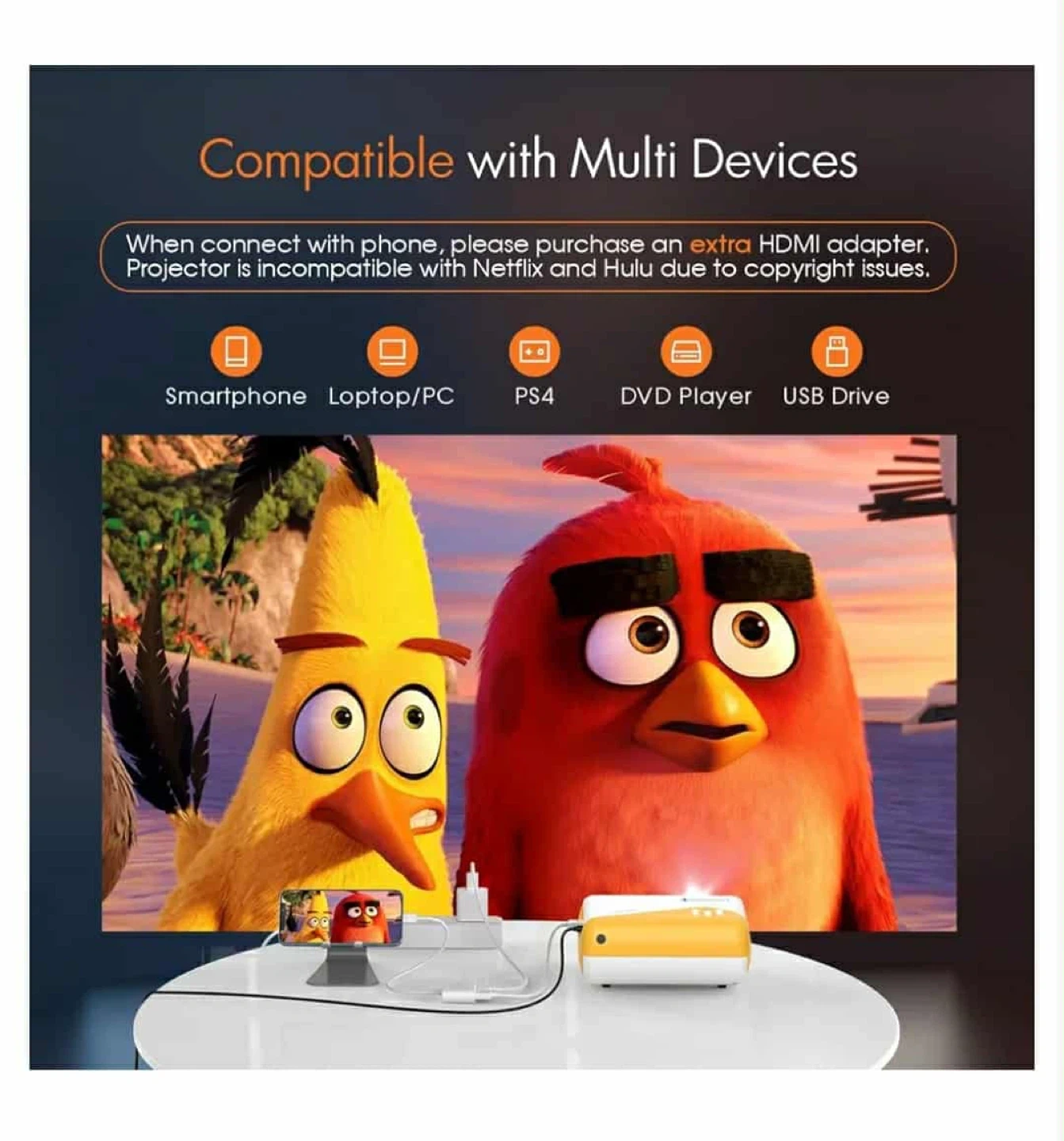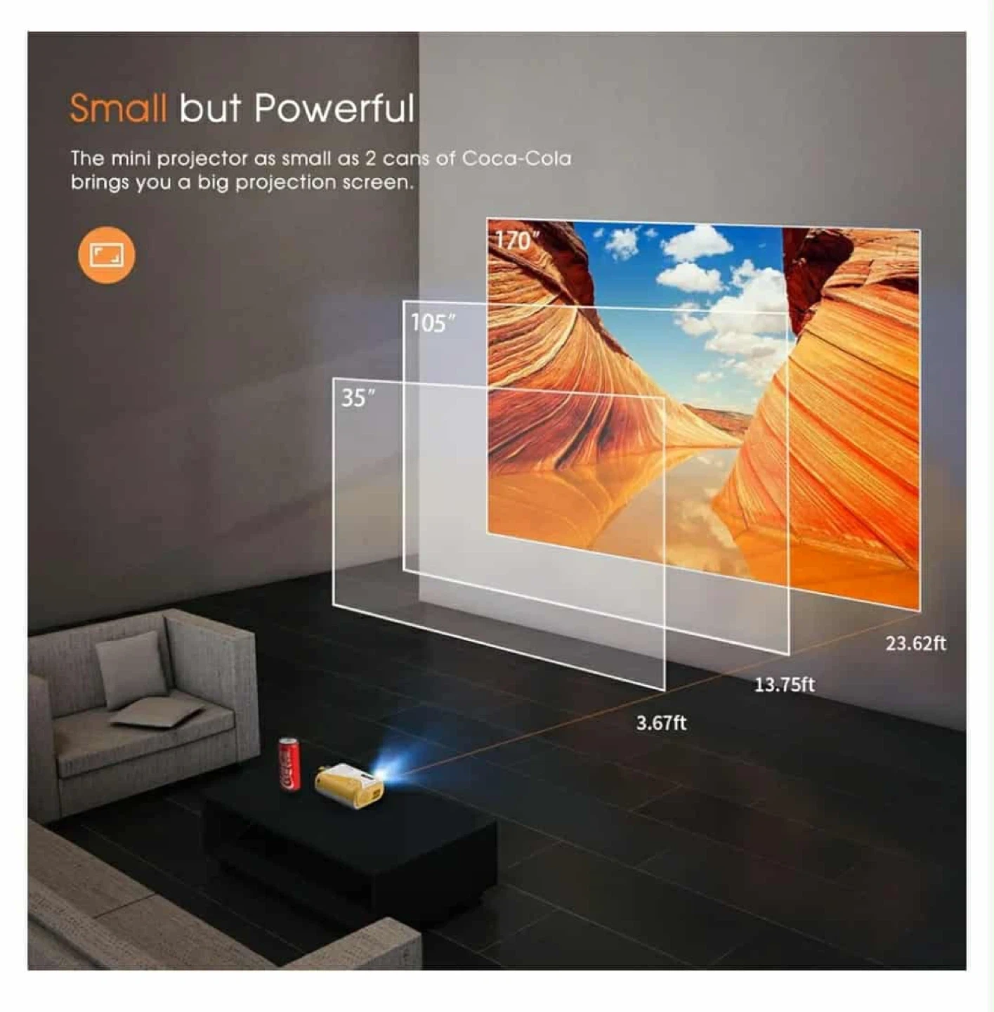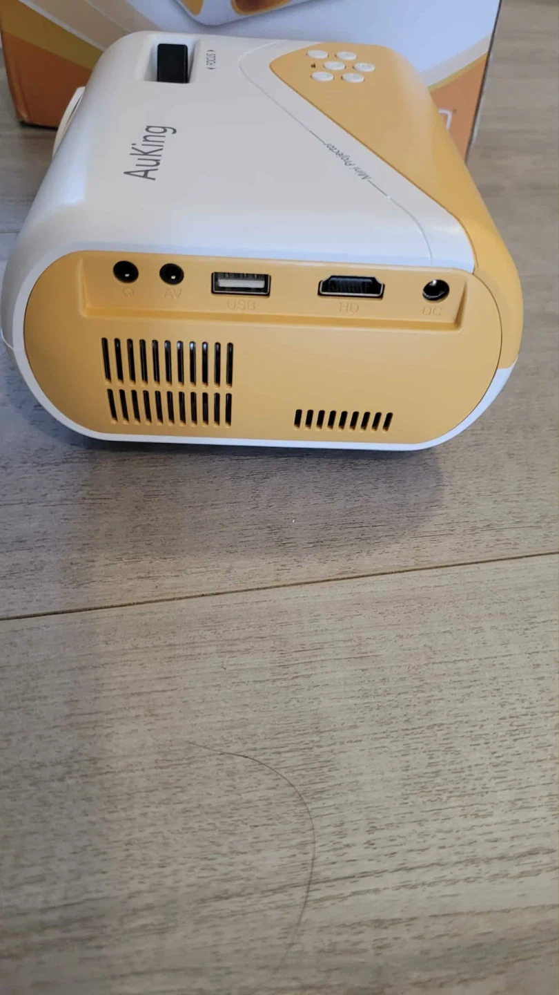 This is an AuKing mini projector. It boasts a lamp life of 50,000 hours. The projector is compatible with multiple devices like smartphones, laptops, and PS4. Its compact size makes it easy to carry around. It projects a screen size up to 170 inches.