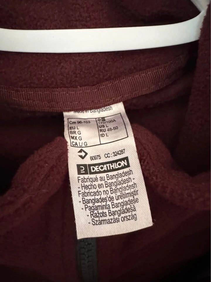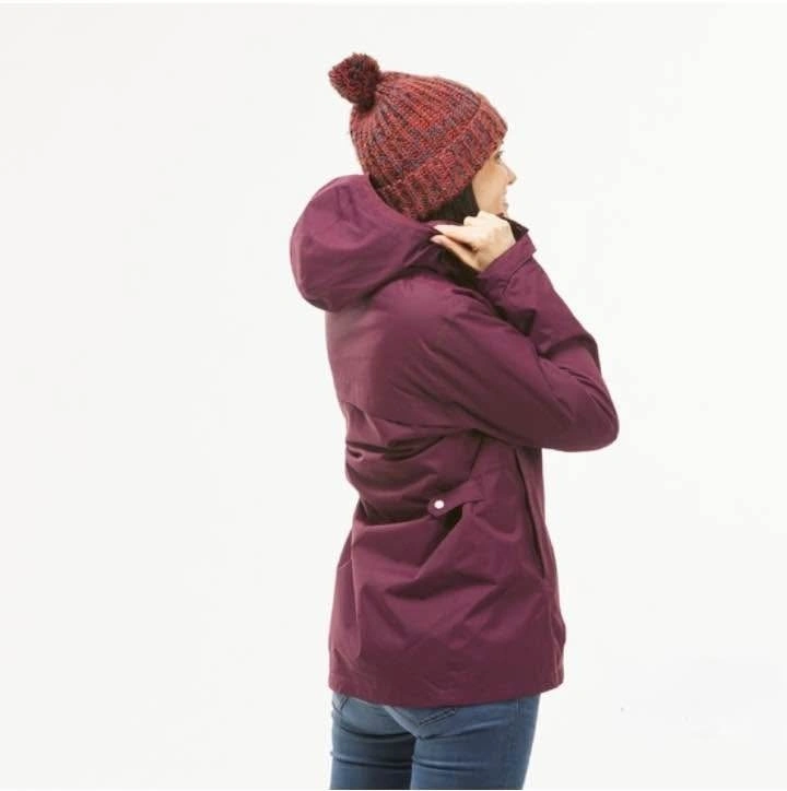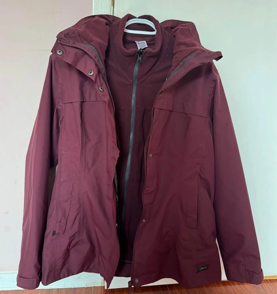 Decathlon Forclaz hiking jacket for women. Color: burgundy. Size: US L (fits 96-103cm chest). Good condition. Suitable for all seasons, great for spring and autumn. Can be worn as a jacket, fleece, or combined. Material is durable. Waterproof effect has lessened with wear but still offers some protection from light rain. Pick up at Markville Mall. Cash only.