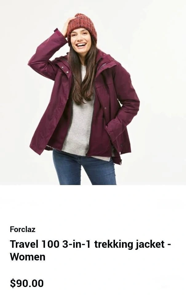 Decathlon Forclaz hiking jacket for women. Color: burgundy. Size: US L (fits 96-103cm chest). Good condition. Suitable for all seasons, great for spring and autumn. Can be worn as a jacket, fleece, or combined. Material is durable. Waterproof effect has lessened with wear but still offers some protection from light rain. Pick up at Markville Mall. Cash only.