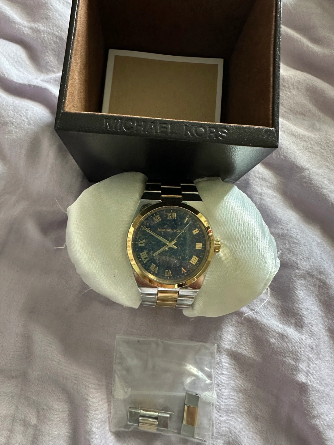 Selling a Michael Kors watch in good condition. It comes with its original box and some extra links. A stylish accessory for any occasion! Two-toned watch, works well with everyday use and matches with every outfit. Classic piece!