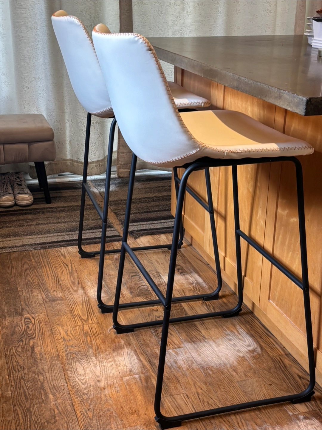 Selling a set of bar stools featuring a sleek design with white faux leather seats and black metal frames. These stools would be a great addition to any kitchen or bar area! Set height, 30”.