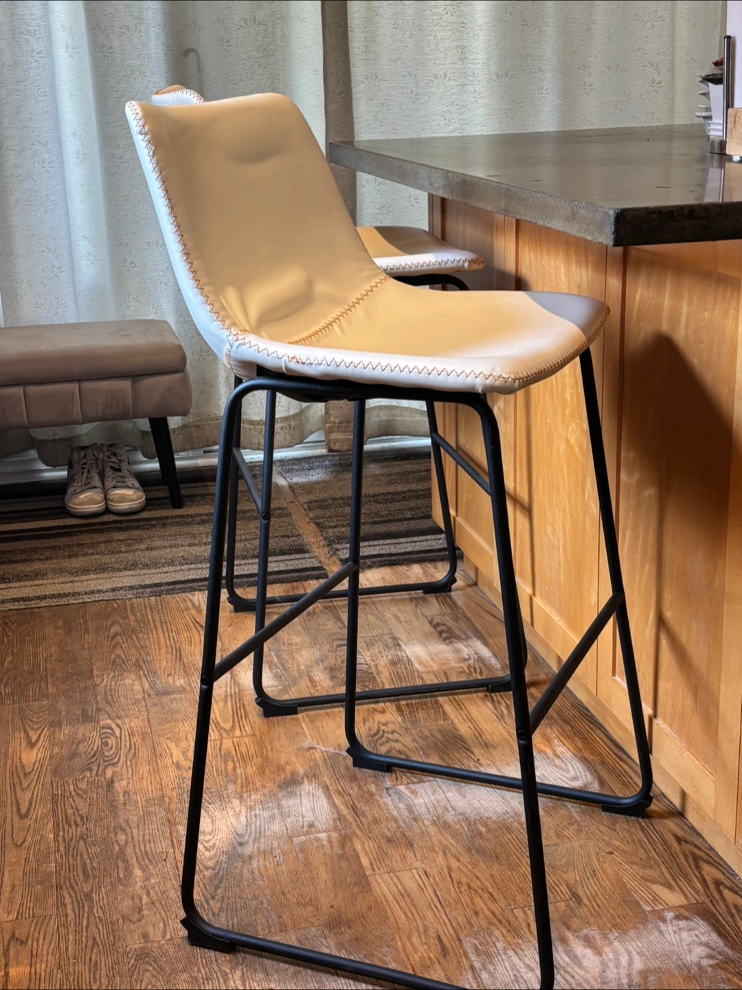 Selling a set of bar stools featuring a sleek design with white faux leather seats and black metal frames. These stools would be a great addition to any kitchen or bar area! Set height, 30”.