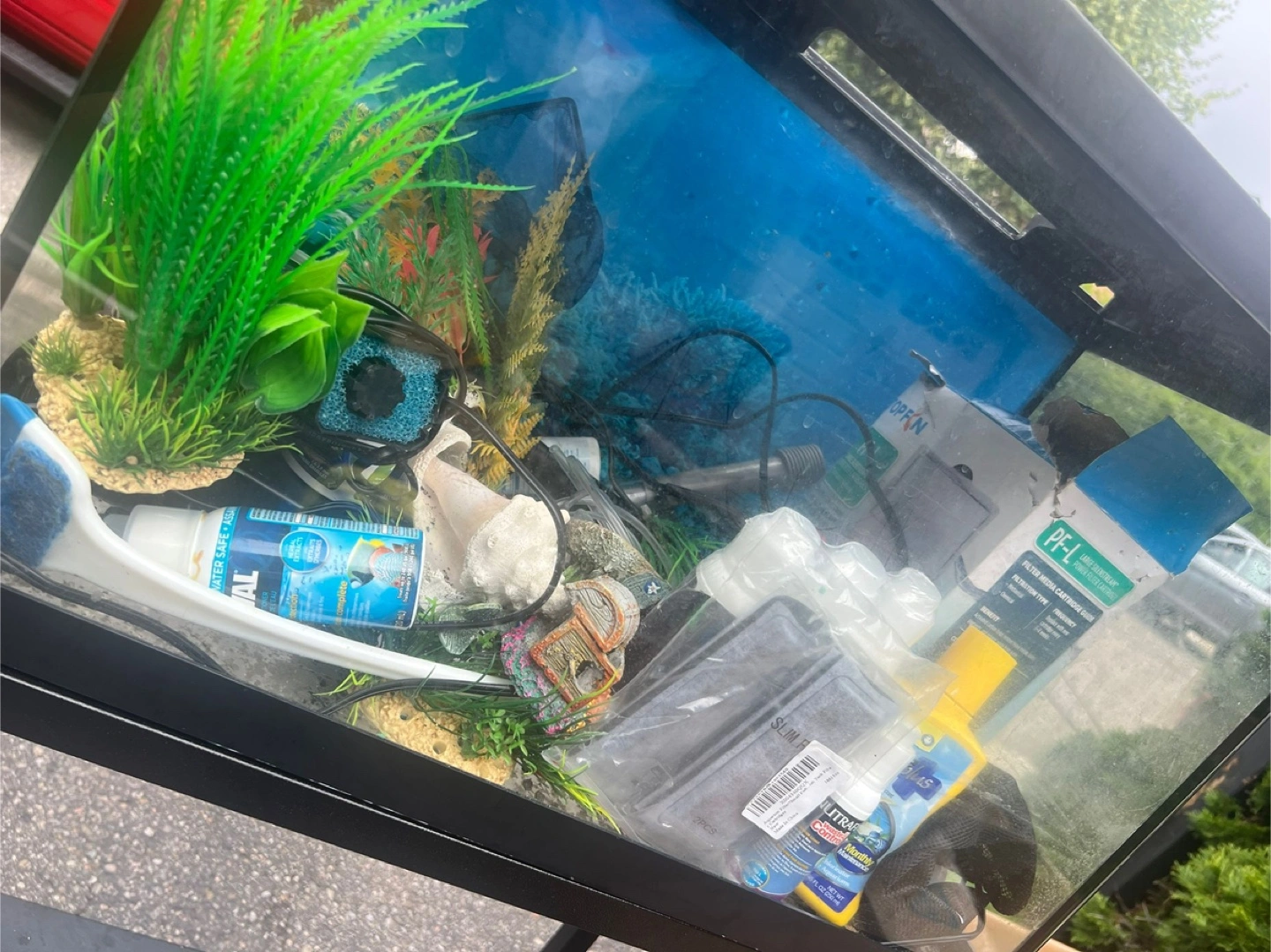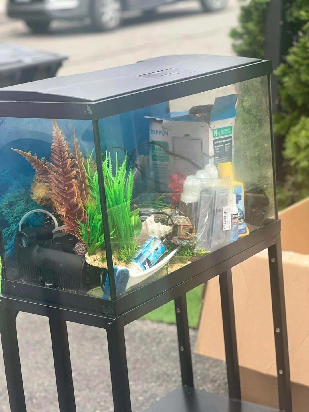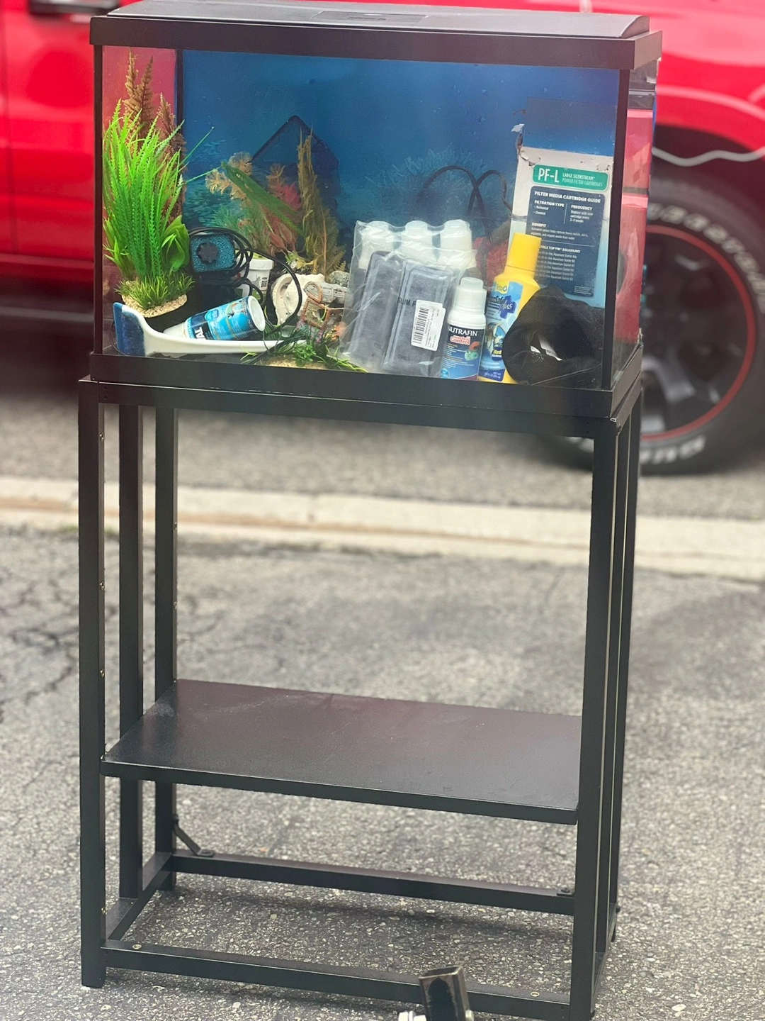 Topfin Fish tank with stand Fish tank size: 24” W x 16” H x 12” D Overall hight with stand: 46” Want to sell it with many related stuff like filters and replacements , heater, oxygen, decorating items and fish food Assembled. Must go asap.