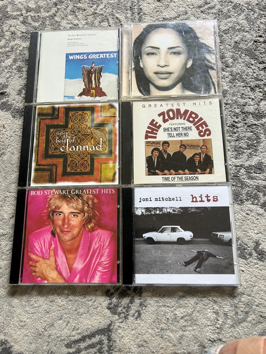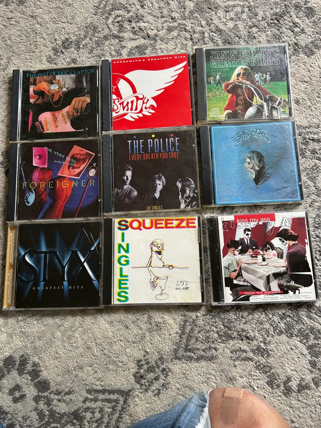 Selling a collection of classic rock and pop CDs. Titles include Wings Greatest, Sade, Clannad, The Zombies, Rod Stewart, Joni Mitchell, Eric Clapton, Aerosmith, Janis Joplin, Foreigner, The Police, Eagles, Styx, Squeeze, Kiss, Squeeze, Elvis Costello, Fleetwood Mac, The Mamas & The Papas, ZZ Top, BTO, The Kinks, Grand Funk Railroad, Steppenwolf, Electric Light Orchestra, and Creedence Clearwater Revival. Perfect for expanding your music collection!$3 each or $2 for $5.Open to bundle offers
