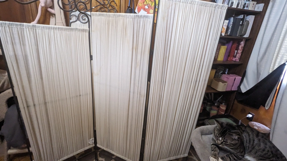 Selling a folding room divider screen. It's in good condition and would be perfect for adding some privacy or dividing a space in your home. It has a light cream color and a metal frame.